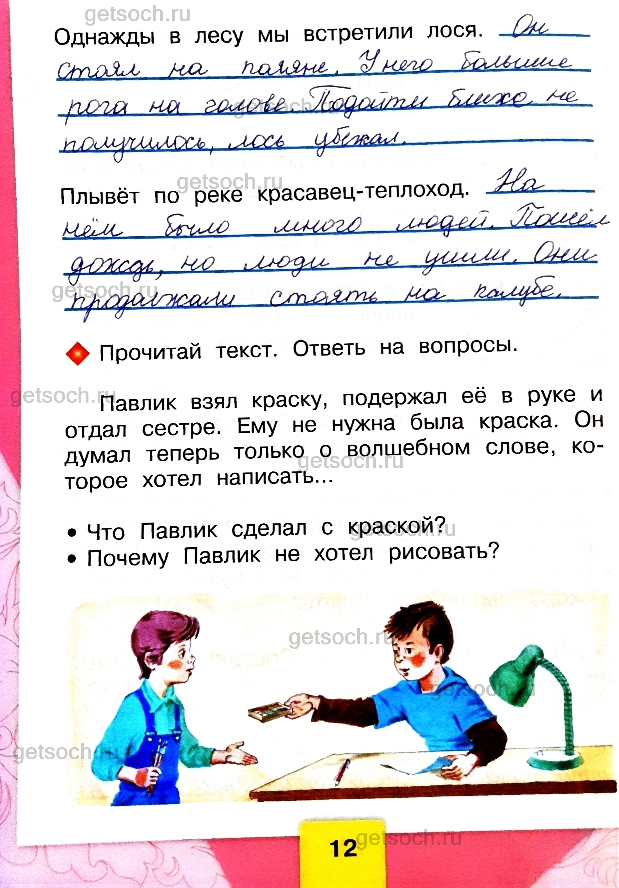 ♦ Прочитай текст. Ответь на вопросы.Павлик взял краску, подержал её в руке и отдал сестре. Ему не нужна была краска. Он думал теперь только о волшебном слове, которое хотел написать…• Что Павлик сделал с краской?• Почему Павлик не хотел рисовать?