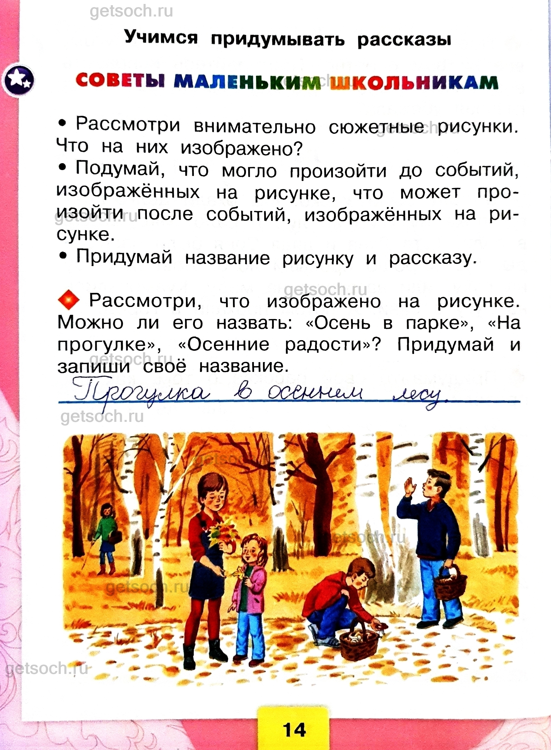 Учимся придумывать рассказы♦ Рассмотри, что изображено на рисунке. Можно ли его назвать: “Осень в парке”, “На прогулке”, “Осенние радости”? Придумай и запиши своё название.