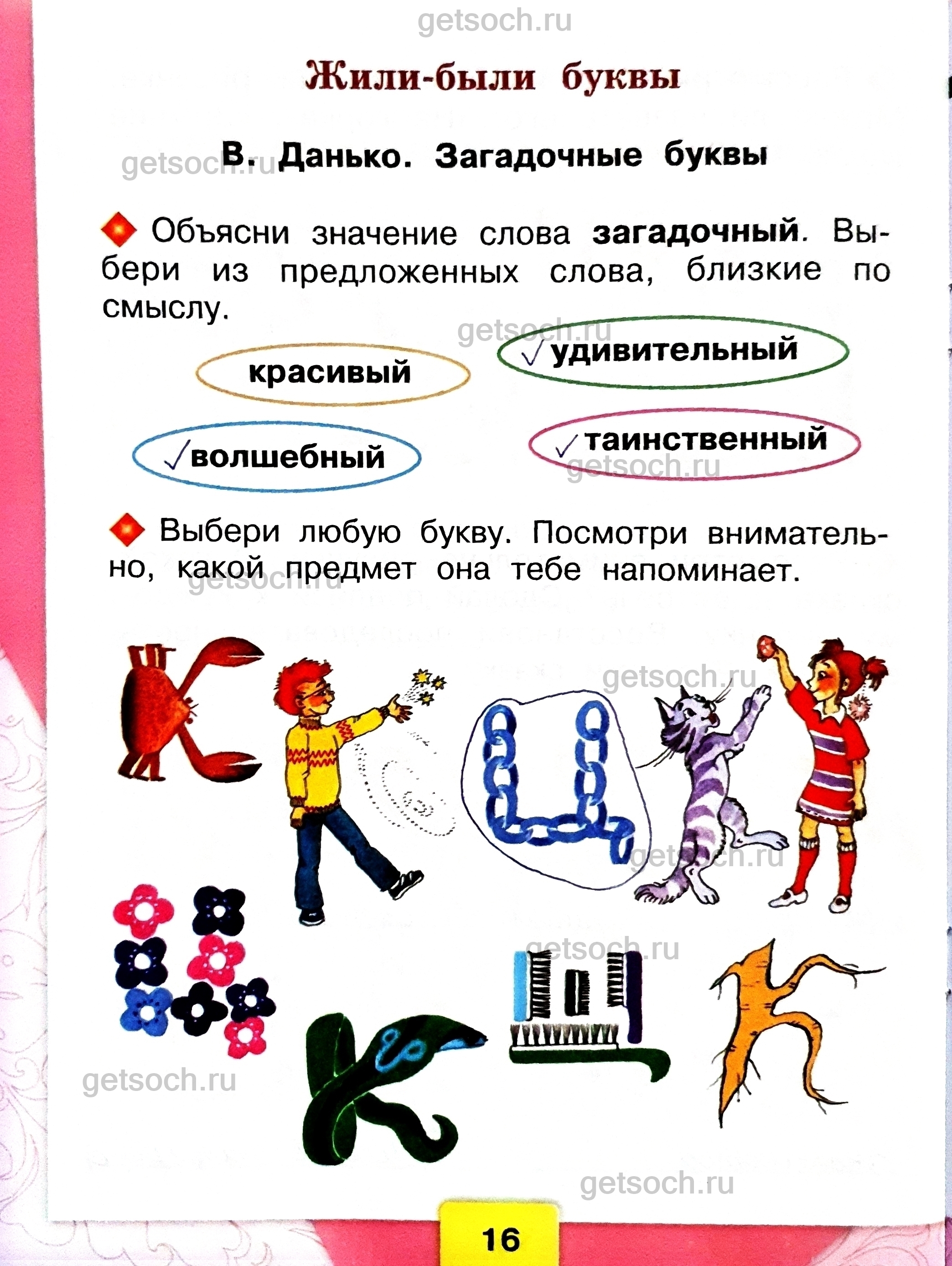 Жили – были буквы♦ Объясни значение слова загадочный. Выбери из предложенных слова, близкие по смыслу.красивый удивительныйволшебный таинственный