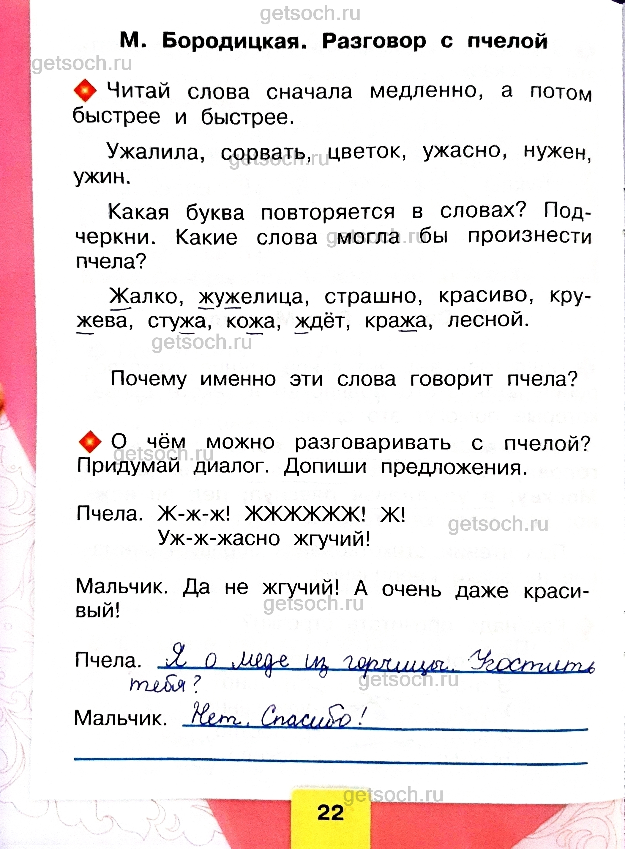 М. Бородицкая. Разговор с пчелой♦ Читай слова сначала медленно, а потом быстрее и быстрее.Какая буква повторяется в словах? Подчеркни. Выбери слова, которые легко было произносить пчеле.Почему именно эти слова говорит пчела?