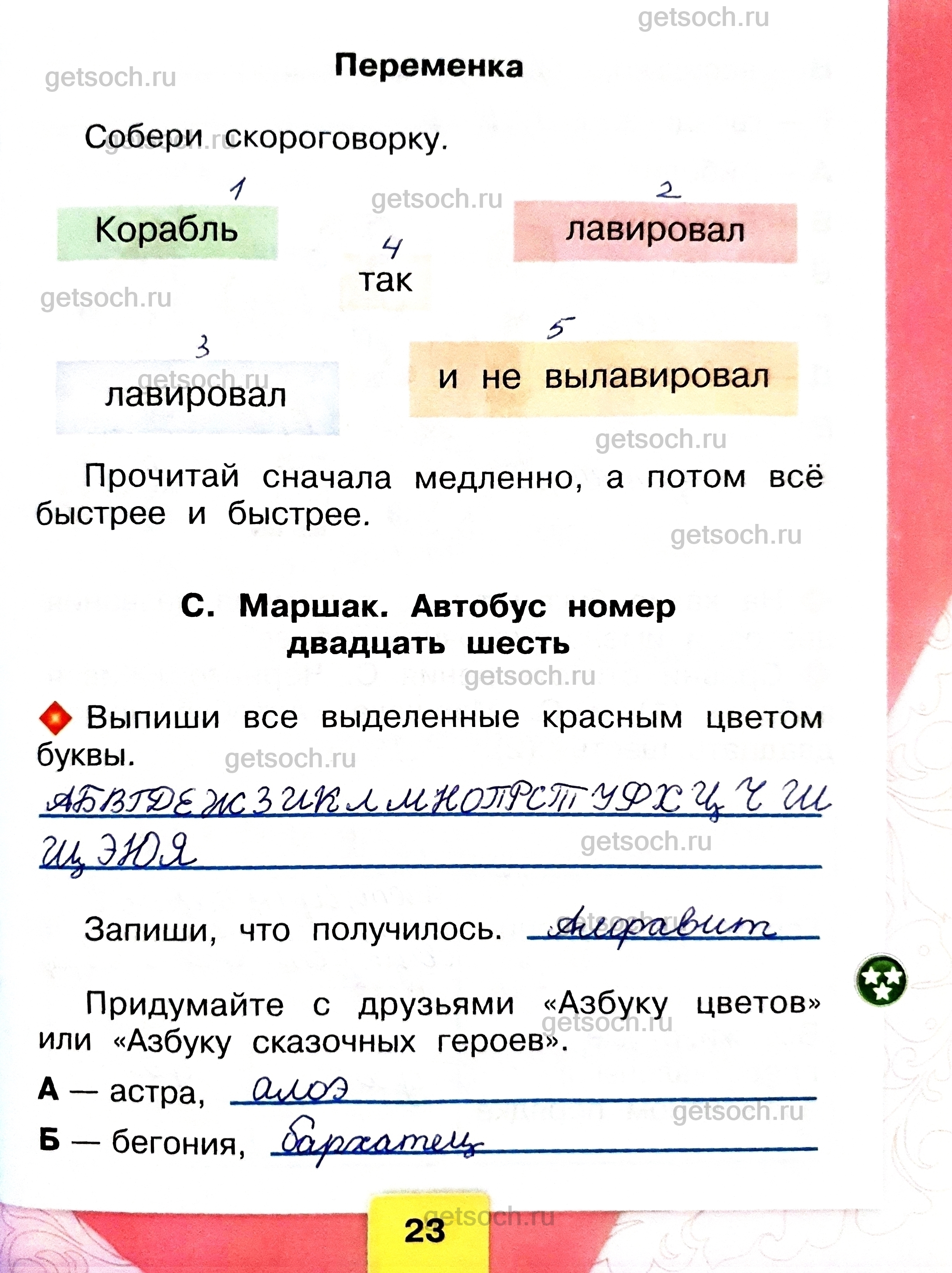С. Маршак. Автобус номер двадцать шесть♦ Выпиши все выделенные красным цветом буквы.______________________________________________Запиши, что получилось. ________________________Придумайте с друзьями “”Азбуку цветов”” или “”Азбуку сказочных героев””.А – астра, ____________________________________Б – бегония, _________________________________В – васильки, ________________________________Г – гвоздика, _________________________________А – Айболит, _________________________________Б – Буратино, ________________________________В – _________________________________________Г – _________________________________________Д – _________________________________________Е – _________________________________________Ж – ________________________________________