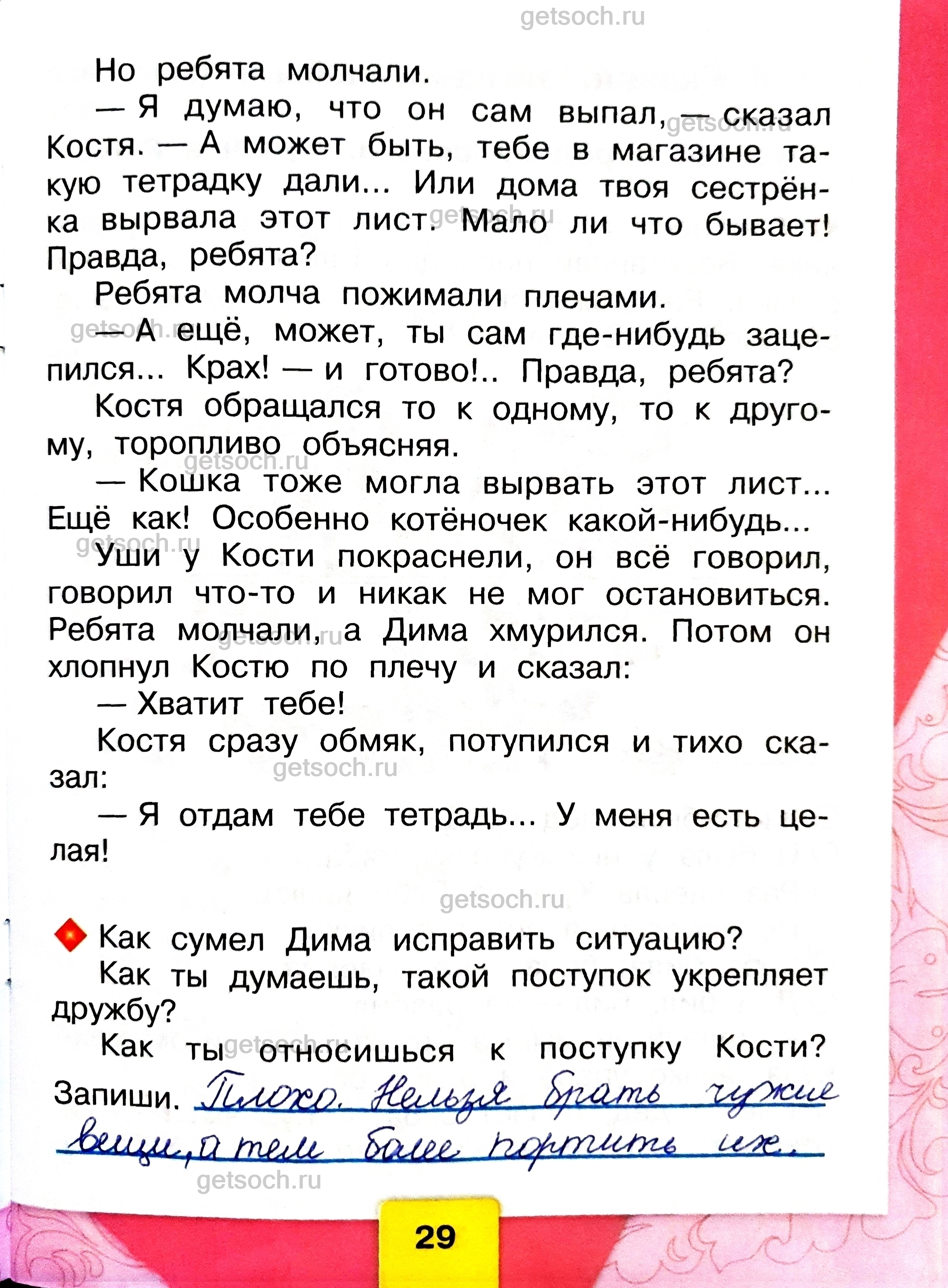 ♦ Как сумел Дима исправить ситуацию?Как ты думаешь, такой поступок укрепляет дружбу?Как ты относишься к поступку Кости?Запиши. ______________________________________