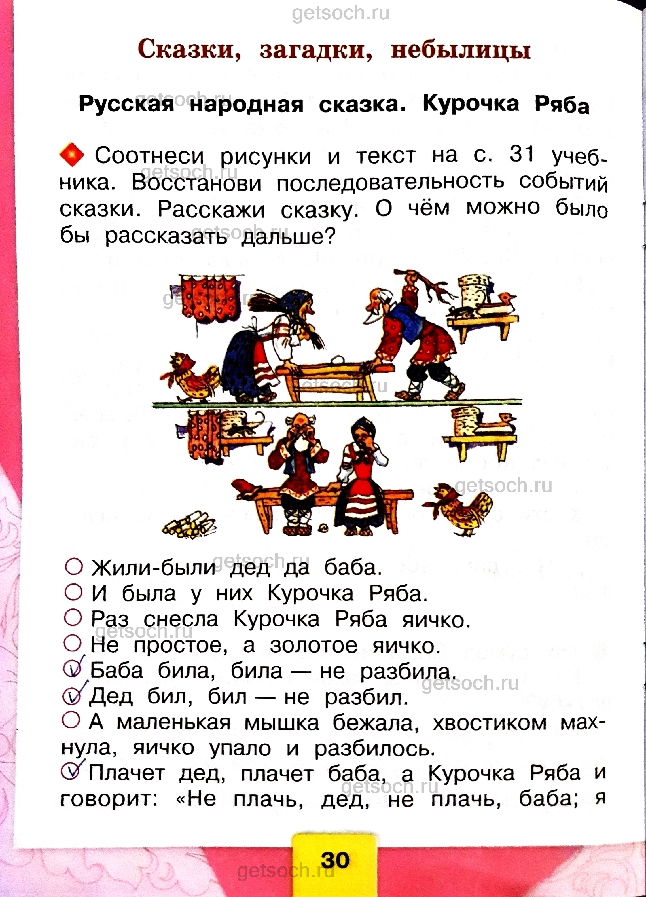 Сказки, загадки, небылицыРусская народная сказка. Курочка Ряба♦ Соотнеси данный ниже текст и рисунки на с. 30 учебника. Восстанови последовательность событий сказки. Расскажи сказку.• Жили были дед да баба.• И была у них Курочка Ряба.• Раз снесла Курочка Ряба яичко.• Не простое, а золотое яичко.• Баба била, била – не разбила.• Дед бил, бил – не разбил.• Плачет дед, плачет баба, а курочка Ряба и говорит: “Не плачь, дед, не плачь, баба; я вам снесу другое яичко. не золотое, а простое…”• А маленькая мышка бежала, хвостиком махнула, яичко упало и разбилось.• Снесла курочка простое яичко.