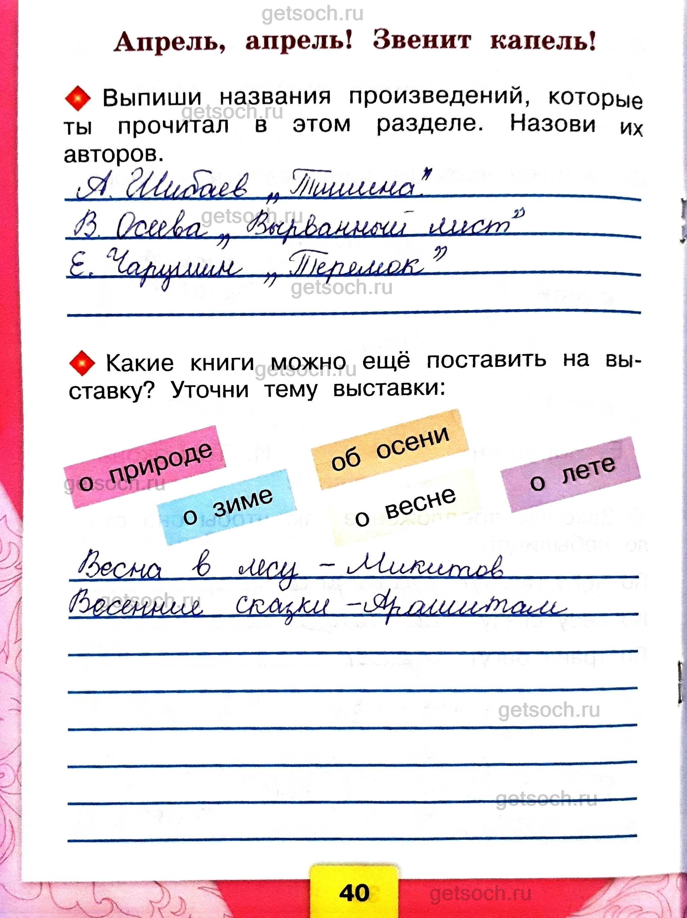 Апрель, апрель! Звенит капель!♦ Выпиши названия произведений, которые ты прочитал в этом разделе. Назови их авторов.____________________________________________________________________________________________