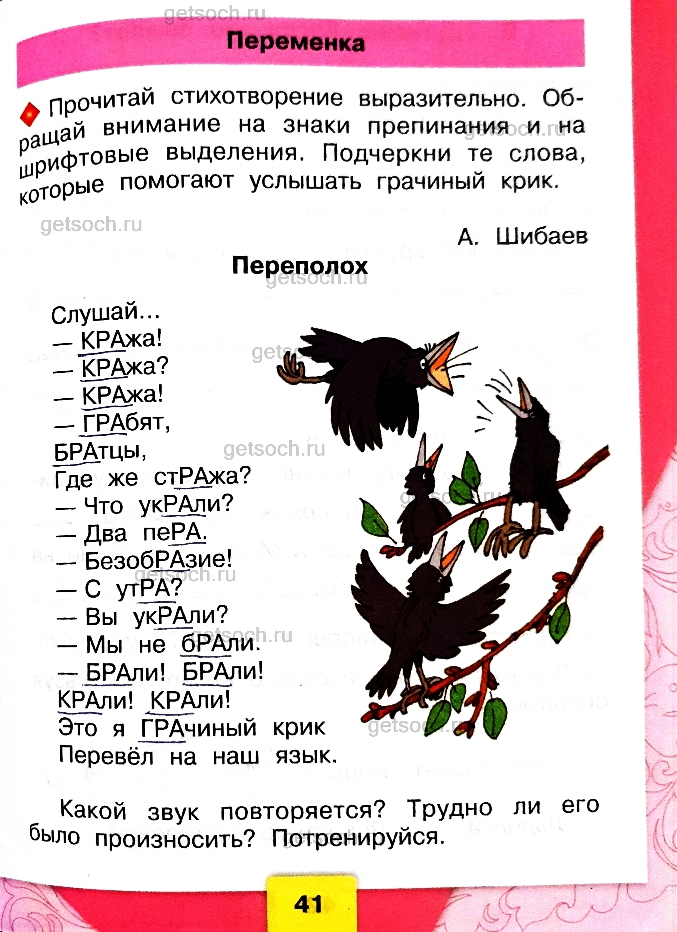 Переменка♦ Прочитай стихотворение выразительно. Обращай внимание на знаки препинания и на шрифтовые выделения. Подчеркни те слова, которые помогают услышать грачиный крик. А. ШибаевПереполохКакой звук повторяется? Трудно ли его было произносить? Потренируйся.