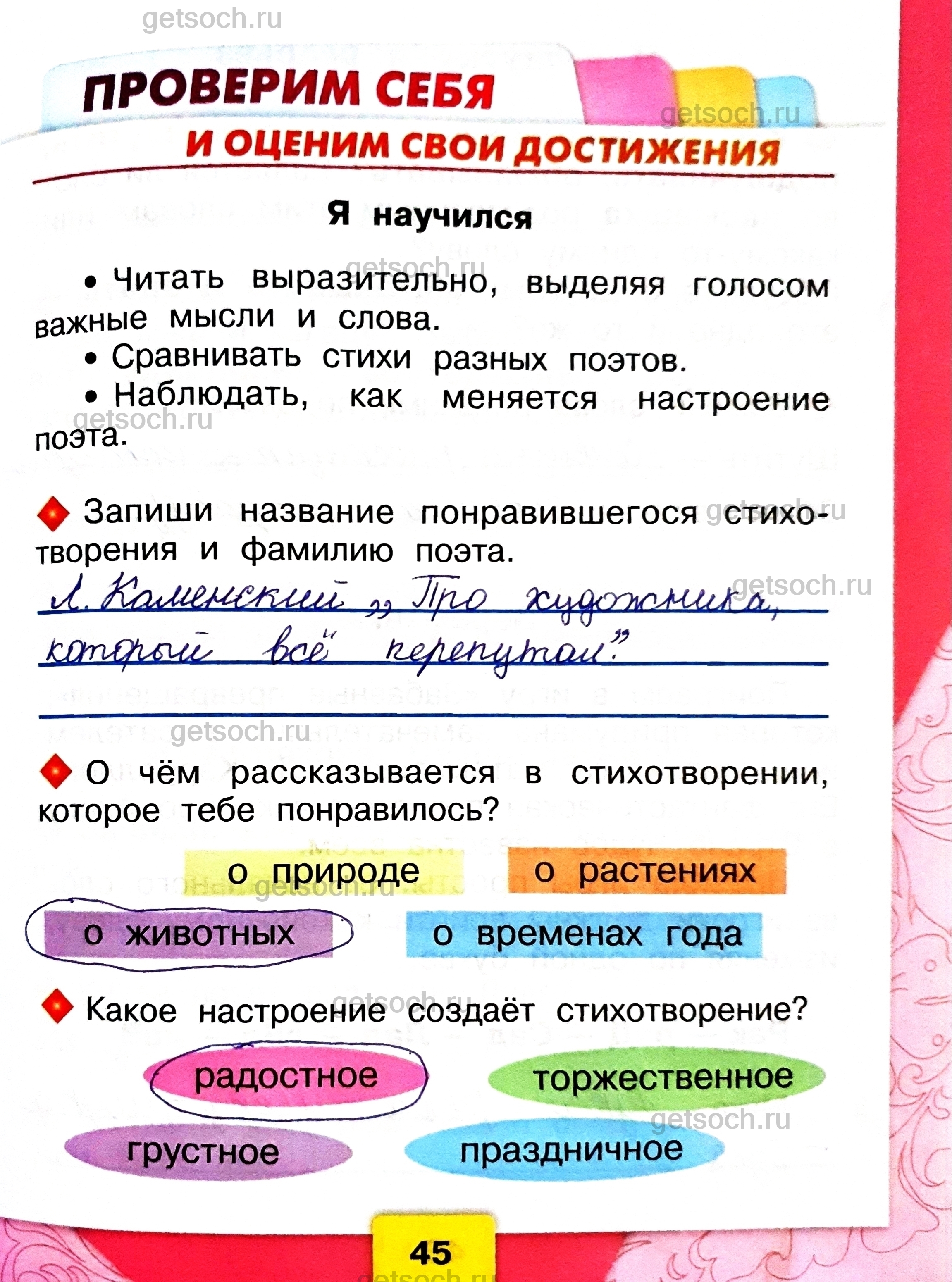 Рассмотрим ответы на задания учебника по литературному чтению для 1 класса автора Бойковой Страница 45