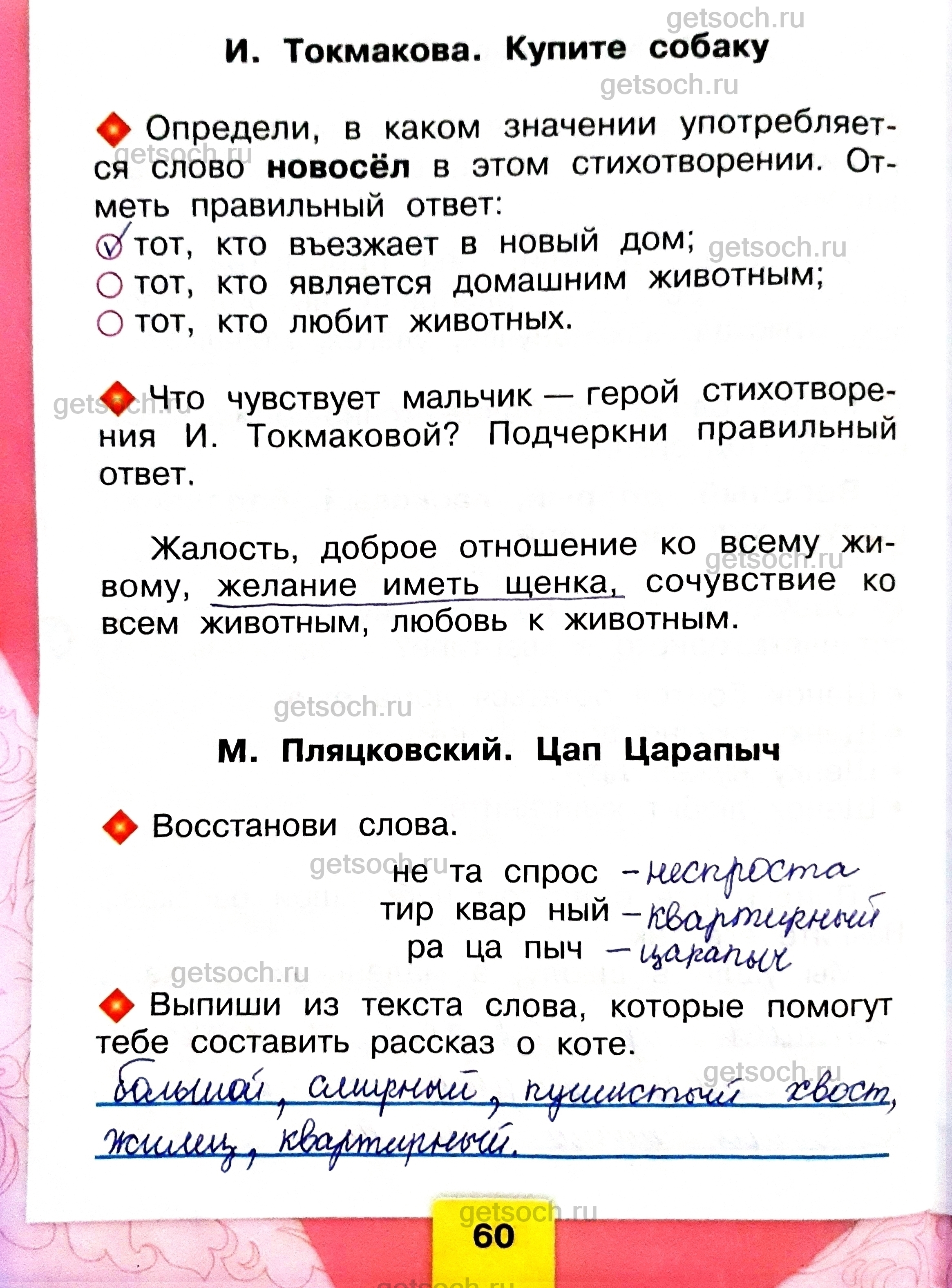 И. Токмакова. Купите собаку♦ Определи, в каком значении употребляется слово новосёл в этом стихотворении. Отметь правильный ответ:• тот, кто въезжает в новый дом;• тот, кто является домашним животным;• тот, кто любит животных.