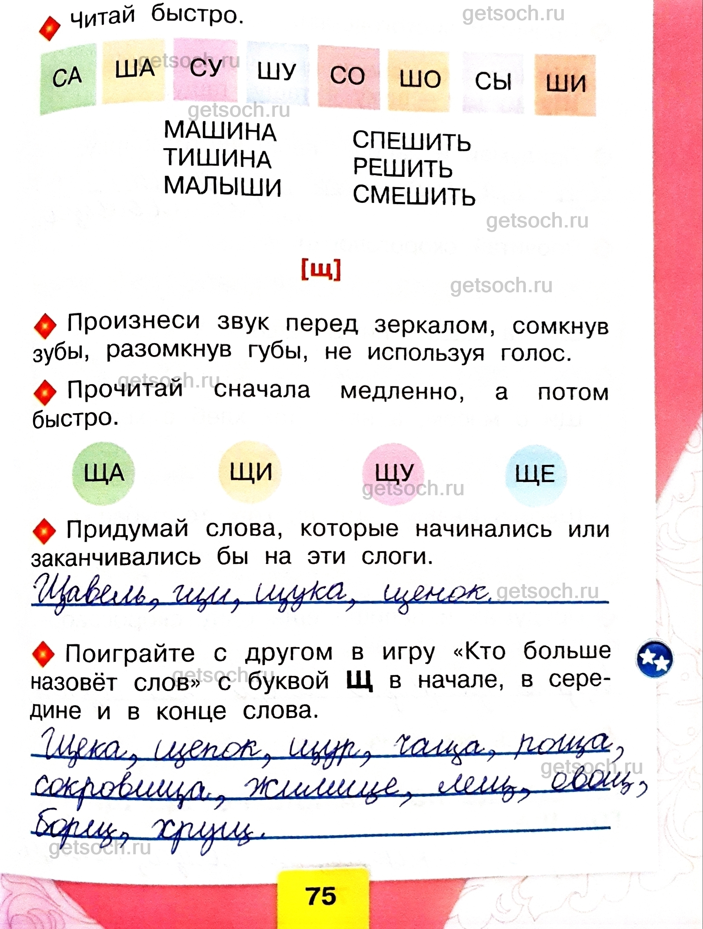 [ Щ ]♦ Произнеси звук перед зеркалом, сомкнув зубы, разомкнув губы, не используя голос.♦ Прочитай сначала медленно, а потом быстро.ЩА ЩИ ЩУ ЩЕ♦ Придумай слова, которые начинались или заканчивались бы на эти слоги.______________________________________________