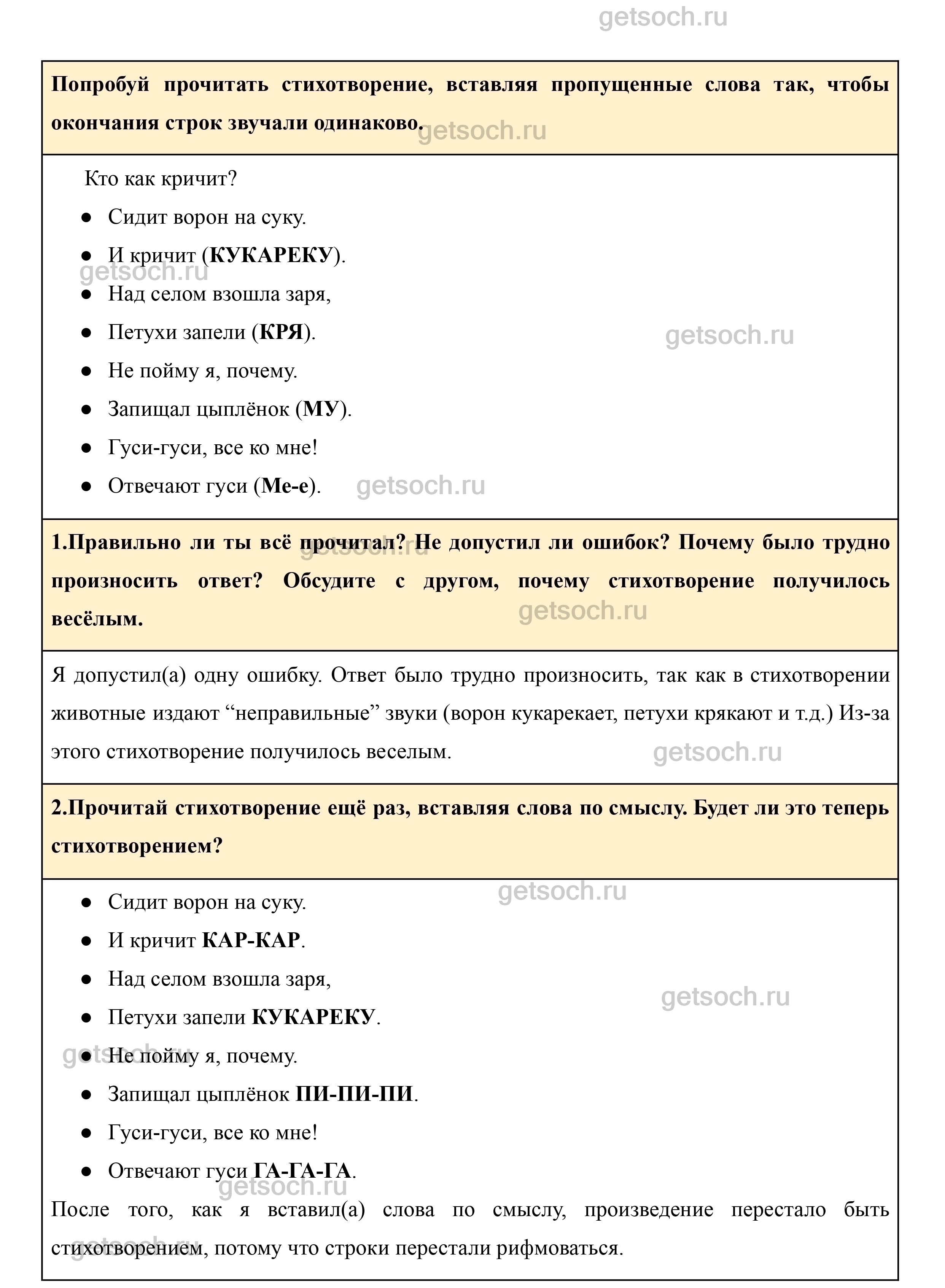 1.Правильно ли ты всё прочитал? Не допустил ли ошибок? Почему было трудно произносить ответ? Обсудите с другом, почему стихотворение получилось весёлым.