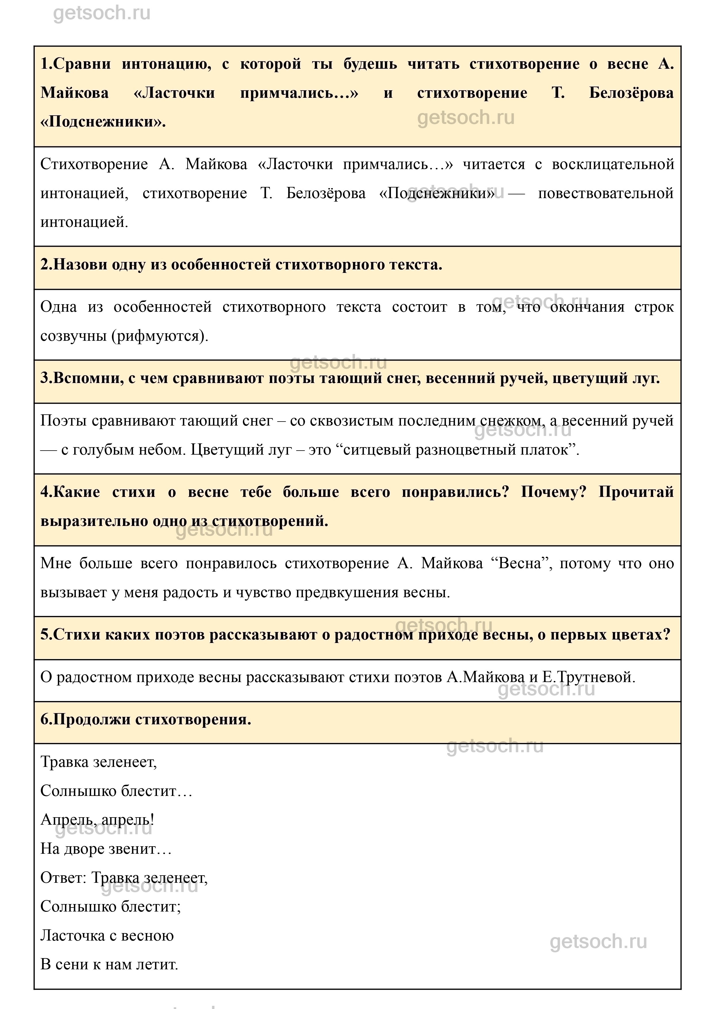1.Сравни интонацию, с которой ты будешь читать стихотворение о весне А. Майкова «Ласточки примчались…» и стихотворение Т. Белозёрова «Подснежники».