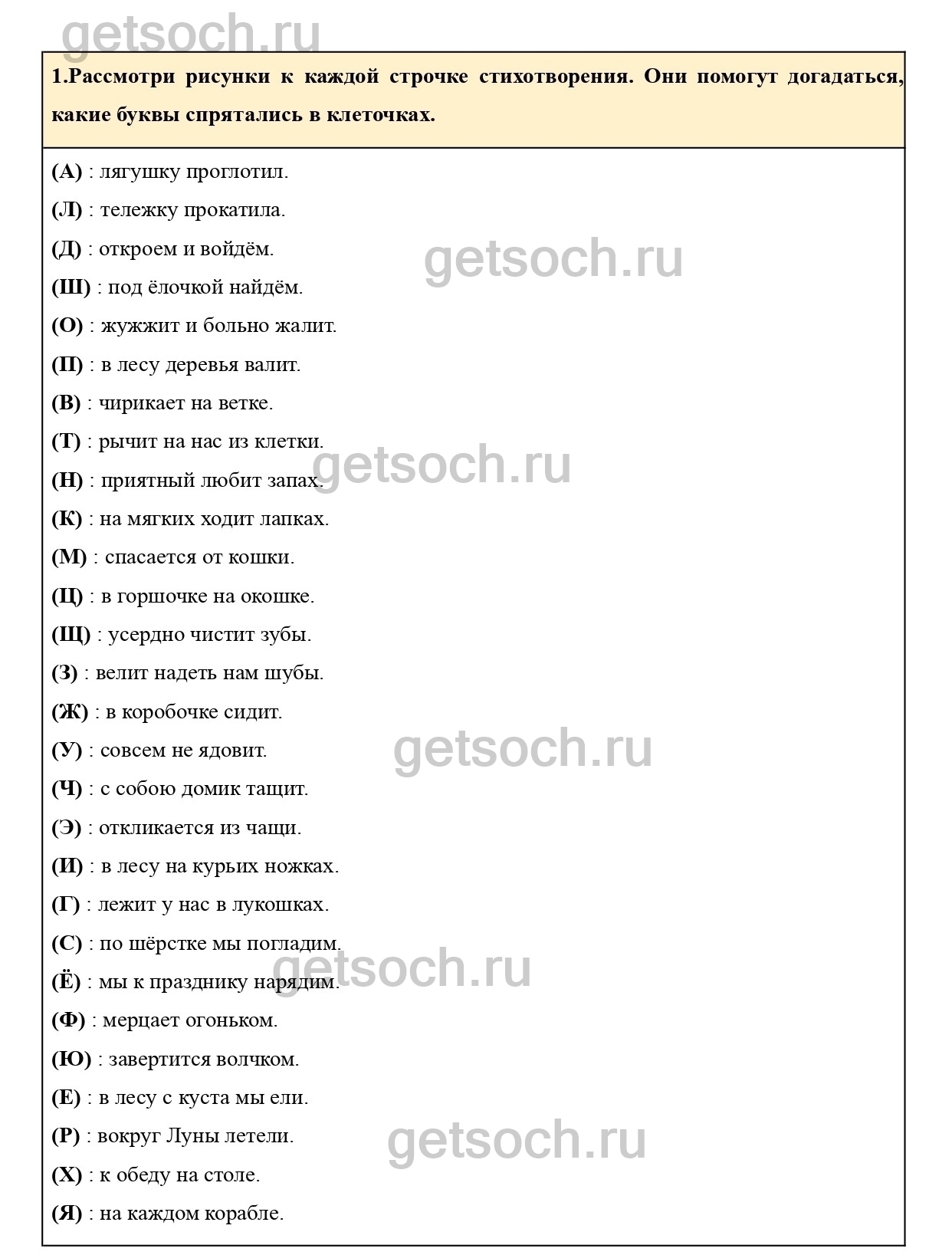 1.Рассмотри рисунки к каждой строчке стихотворения. Они помогут догадаться, какие буквы спрятались в клеточках.
