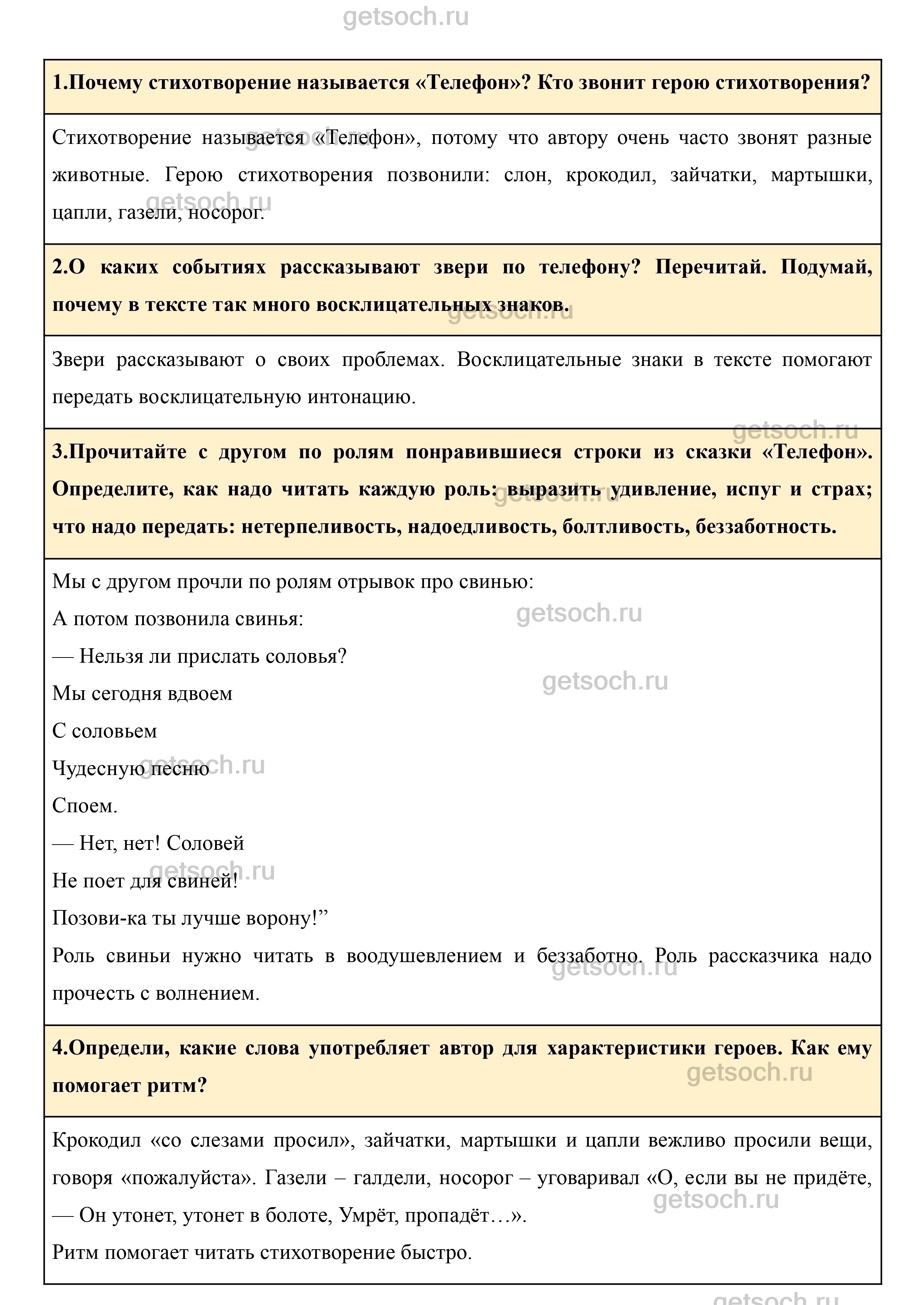 3.Прочитайте с другом по ролям понравившиеся строки из сказки «Телефон». Определите, как надо читать каждую роль: выразить удивление, испуг и страх; что надо передать: нетерпеливость, надоедливость, болтливость, беззаботность.