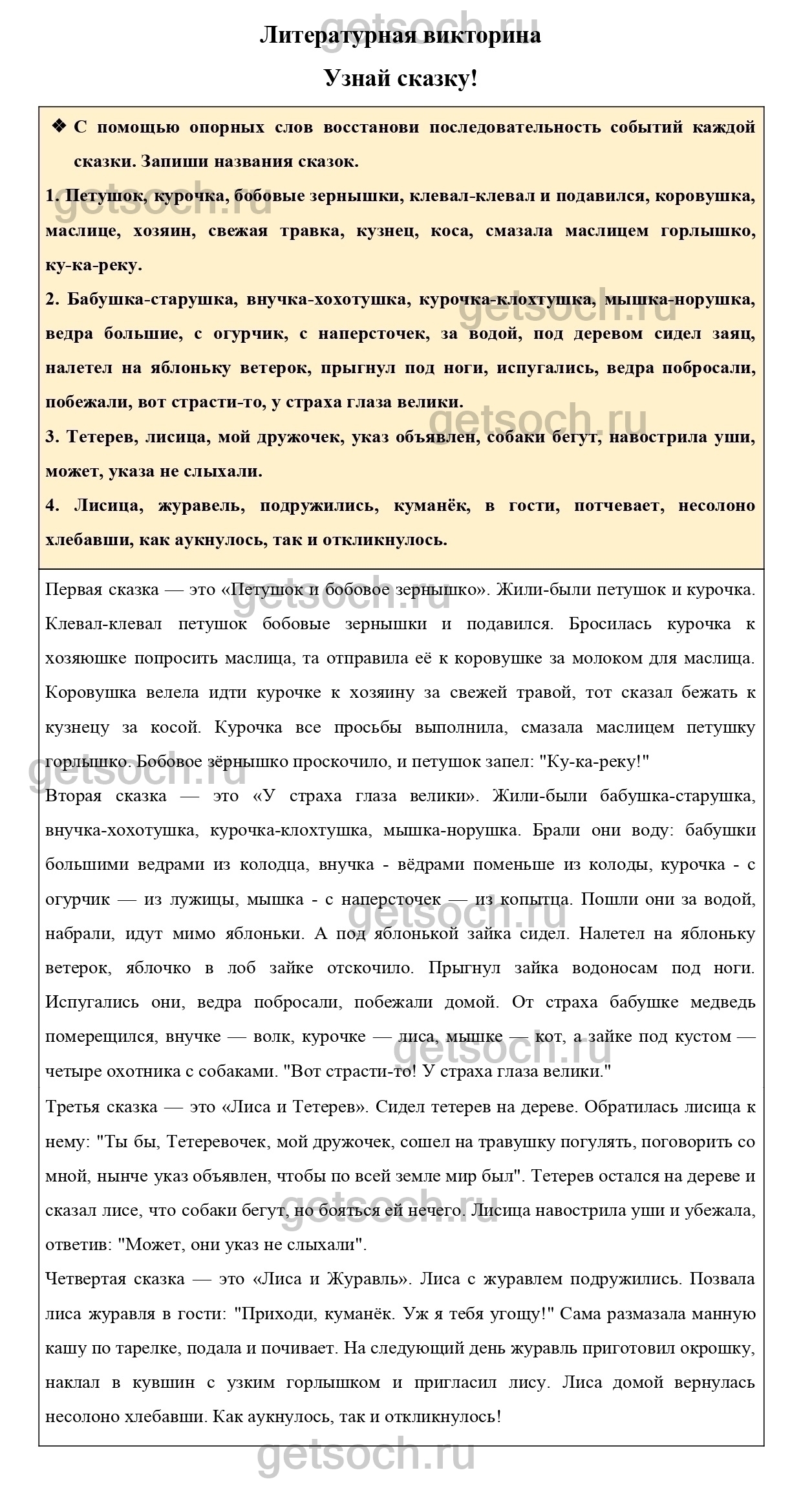 С помощью опорных слов восстанови последовательность событий каждой сказки. Запиши названия сказок.