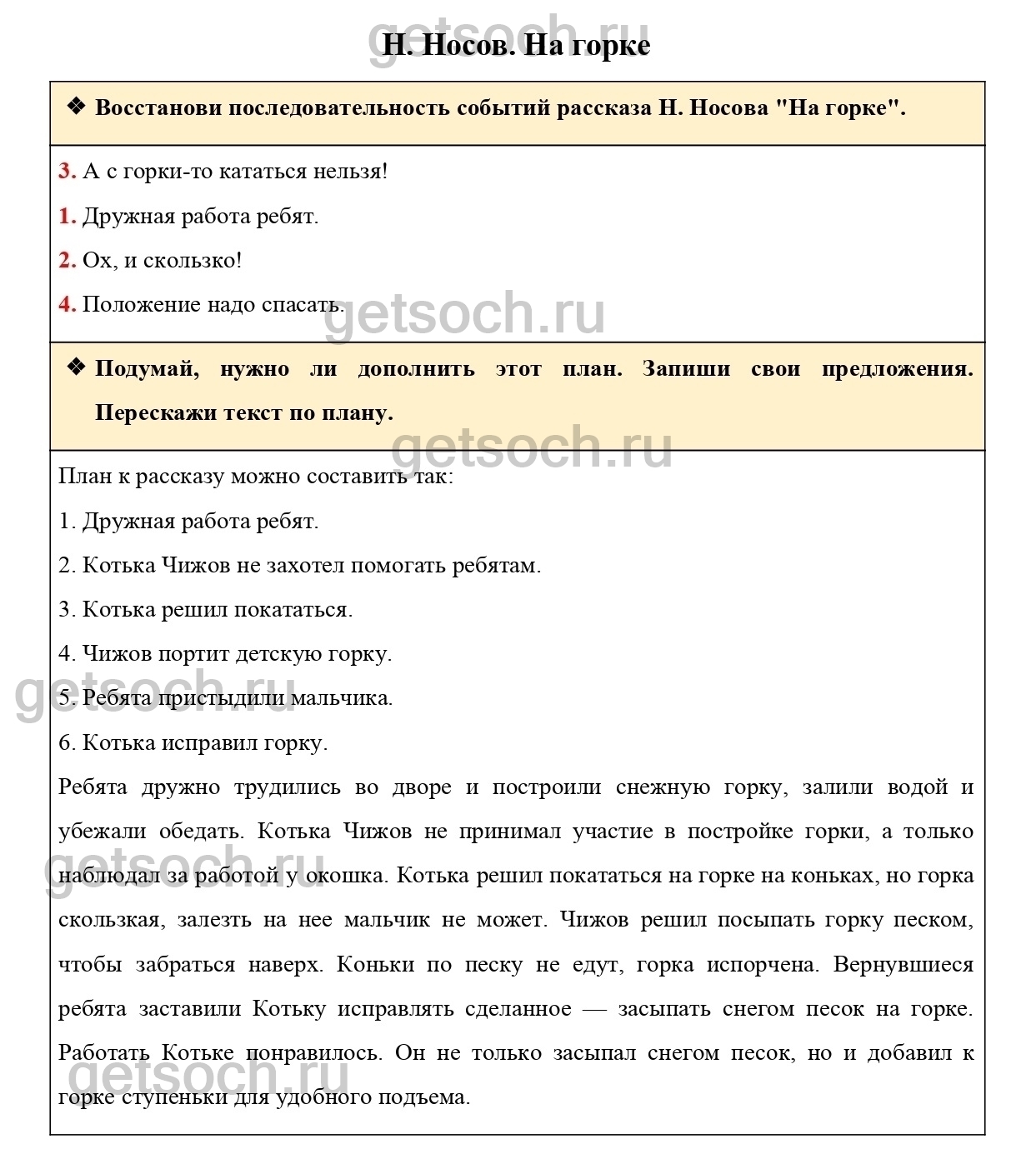 Восстанови последовательность событий рассказа Н. Носова “На горке”.