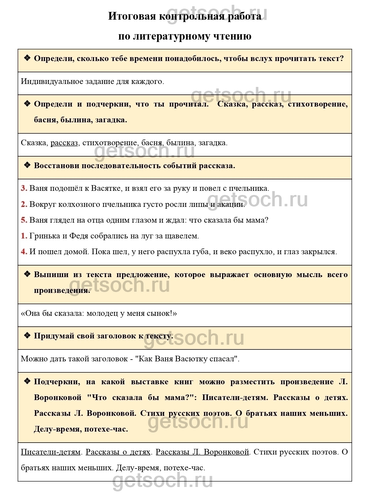 Подчеркни, на какой выставке книг можно разместить произведение Л. Воронковой “Что сказала бы мама?”: Писатели-детям. Рассказы о детях. Рассказы Л. Воронковой. Стихи русских поэтов. О братьях наших меньших. Делу-время, потехе-час.