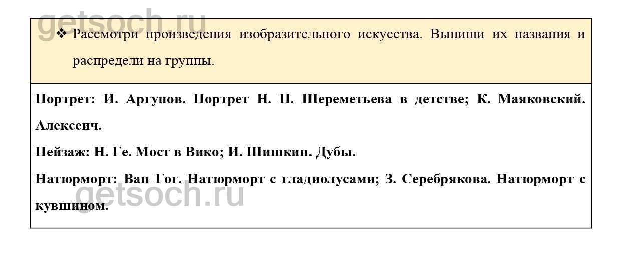 Рассмотри произведения изобразительного искусства. Выпиши их названия и распредели на группы.