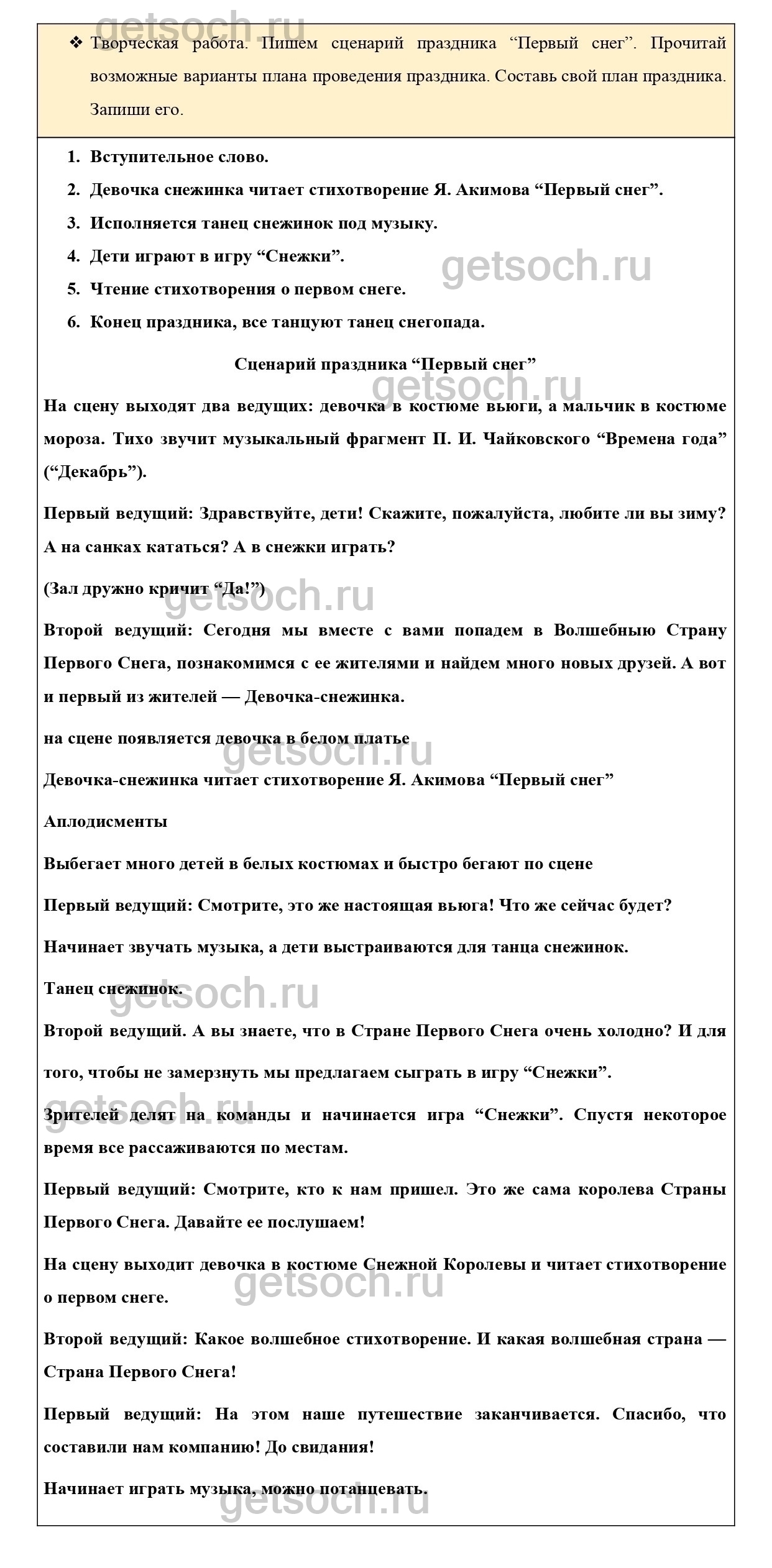 Творческая работа. Пишем сценарий праздника “Первый снег”. Прочитай возможные варианты плана проведения праздника. Составь свой план праздника. Запиши его.