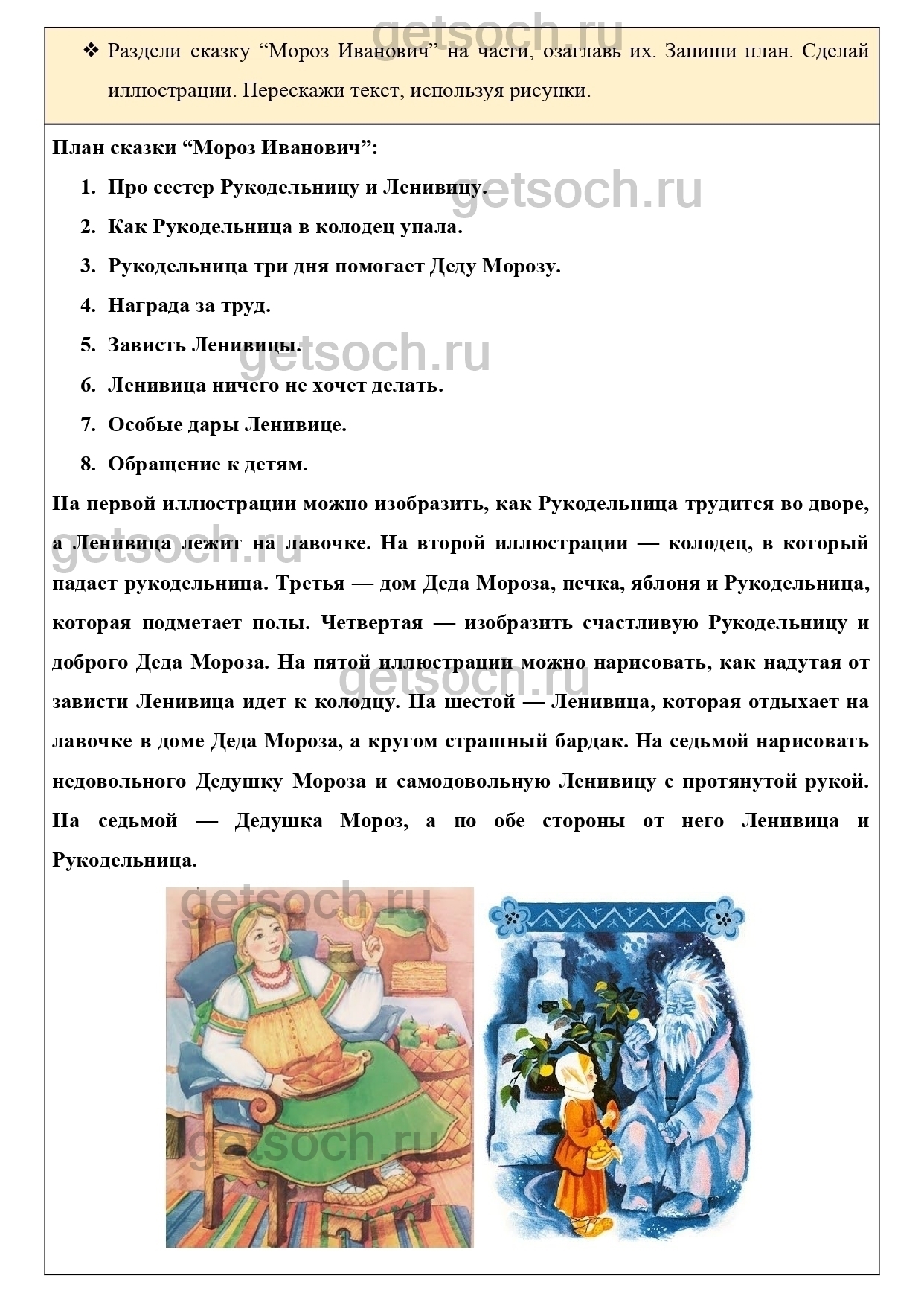 Раздели сказку “Мороз Иванович” на части, озаглавь их. Запиши план. Сделай иллюстрации. Перескажи текст, используя рисунки.