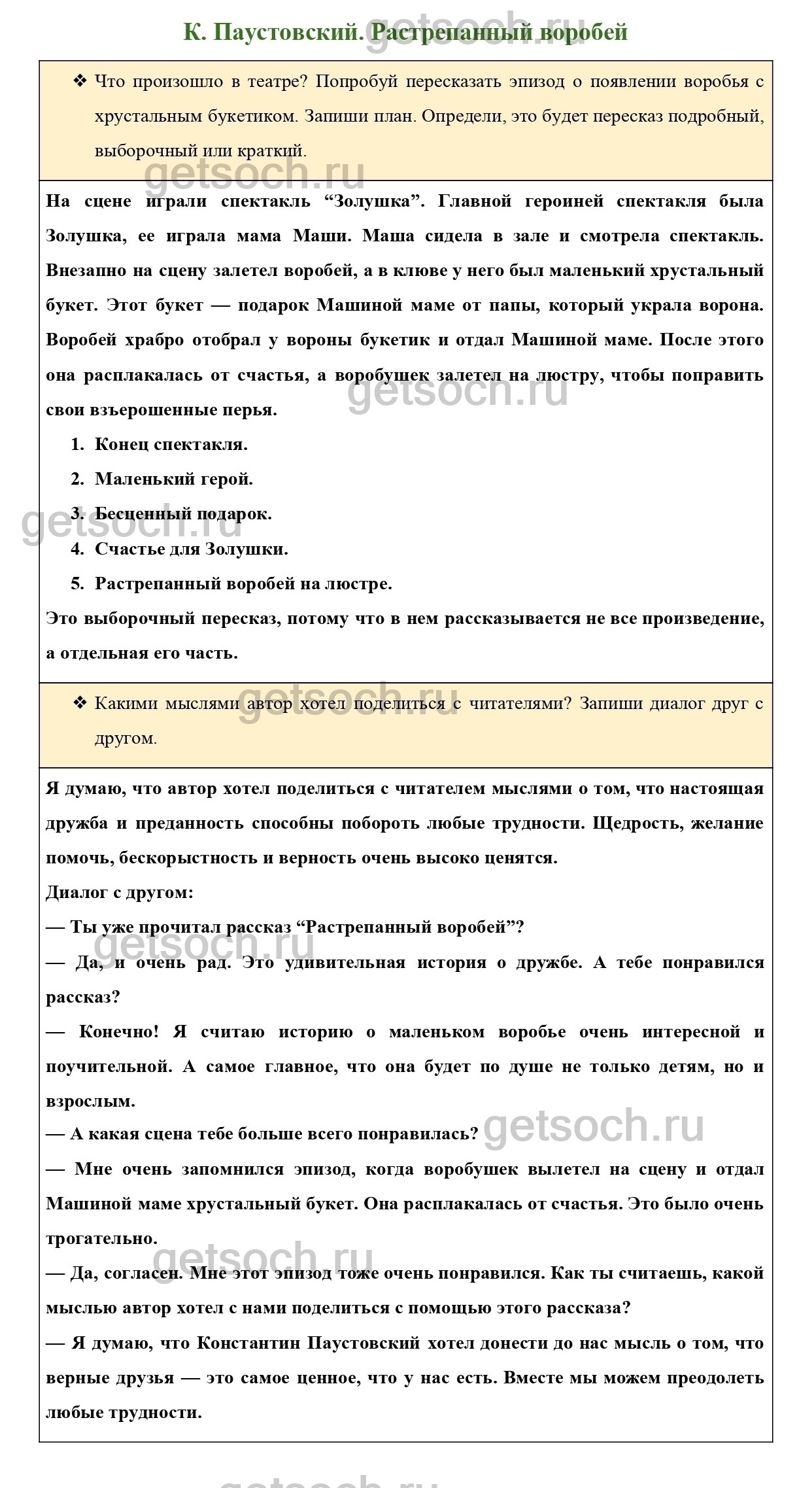 Что произошло в театре? Попробуй пересказать эпизод о появлении воробья с хрустальным букетиком. Запиши план. Определи, это будет пересказ подробный, выборочный или краткий.