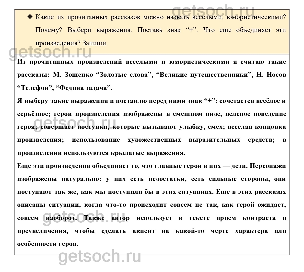 Какие из прочитанных рассказов можно назвать веселыми, юмористическими? Почему? Выбери выражения. Поставь знак “+”. Что еще объединяет эти произведения? Запиши.