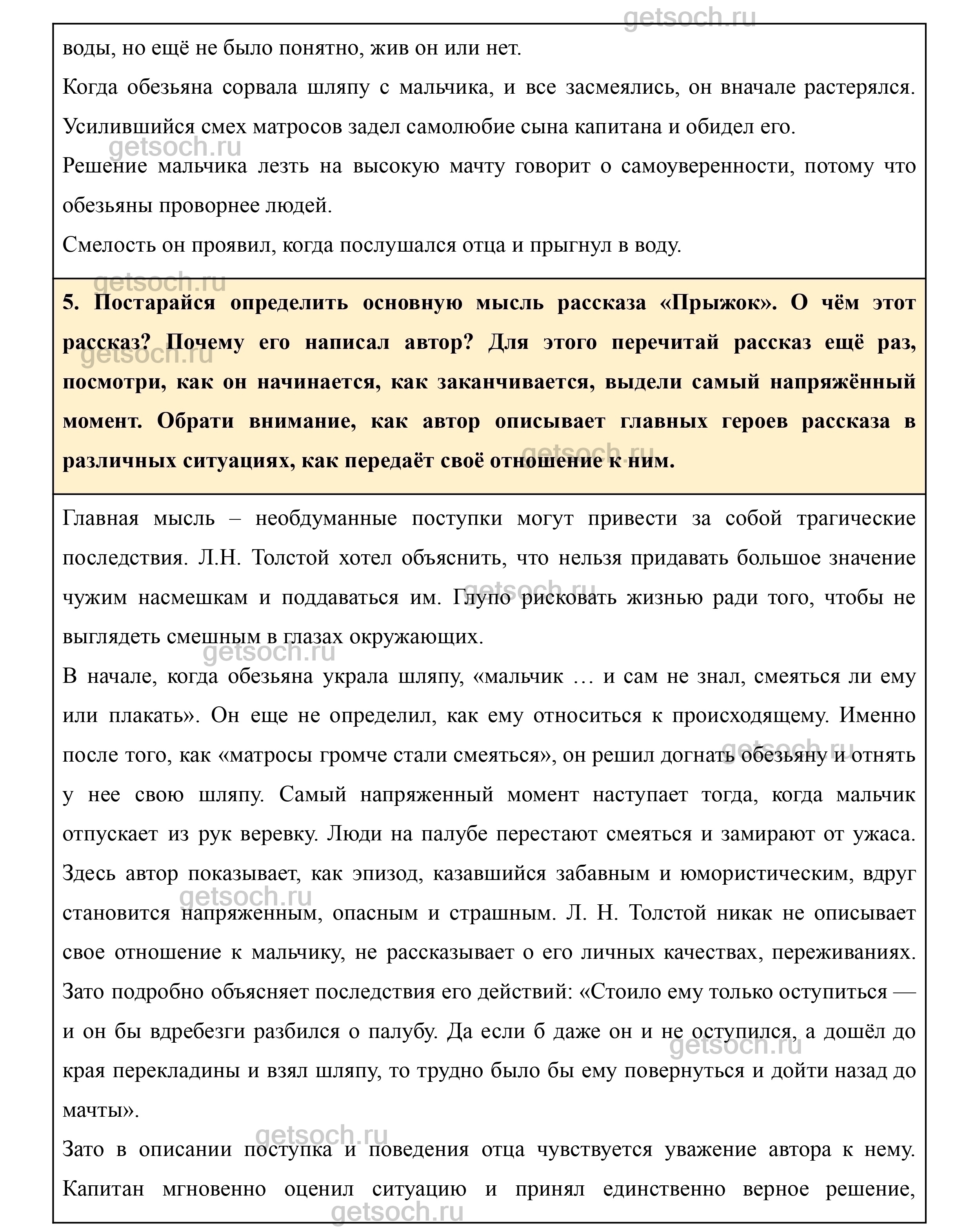 5. Постарайся определить основную мысль рассказа «Прыжок». О чём этот рассказ? Почему его написал автор? Для этого перечитай рассказ ещё раз, посмотри, как он начинается, как заканчивается, выдели самый напряжённый момент. Обрати внимание, как автор описывает главных героев рассказа в различных ситуациях, как передаёт своё отношение к ним.