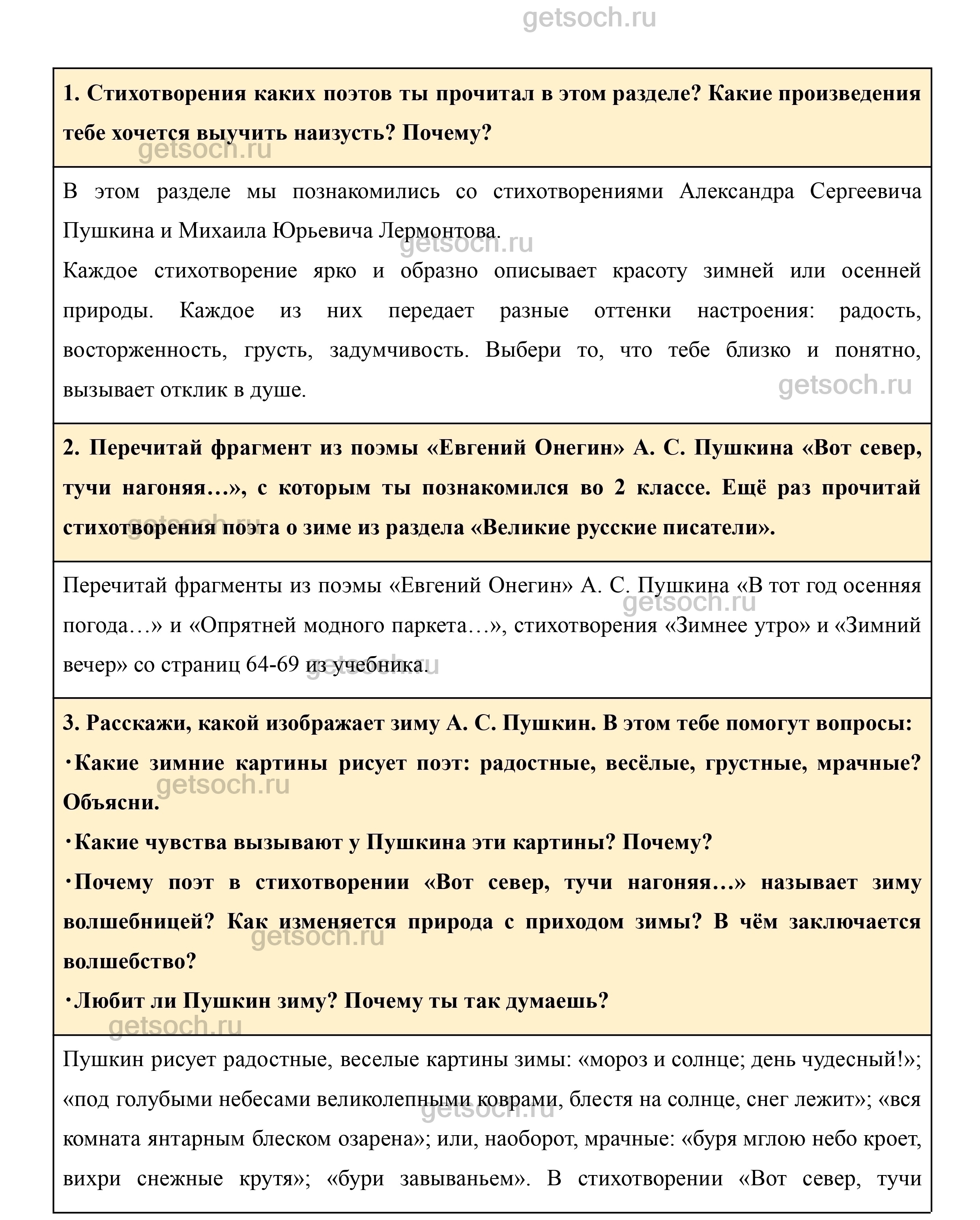 2. Перечитай фрагмент из поэмы «Евгений Онегин» А. С. Пушкина «Вот север, тучи нагоняя…», с которым ты познакомился во 2 классе. Ещё раз прочитай стихотворения поэта о зиме из раздела «Великие русские писатели».
