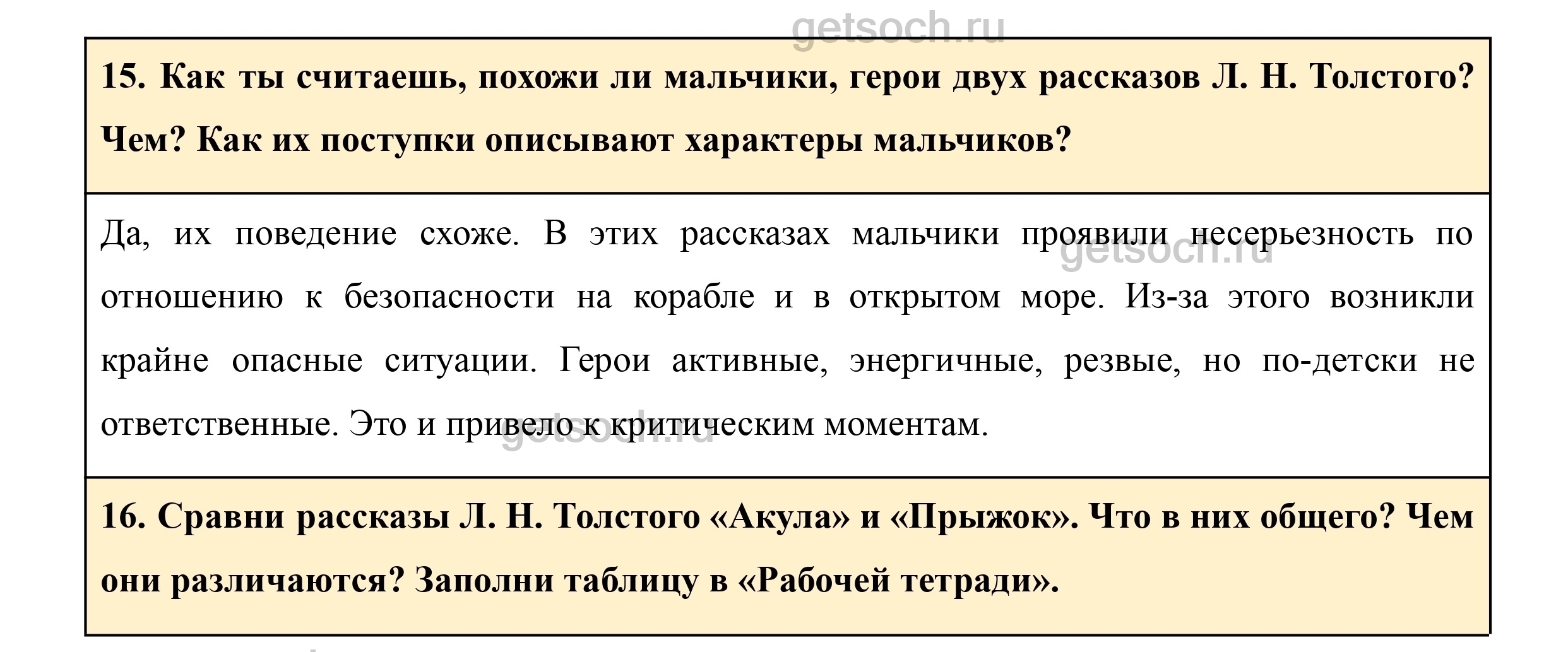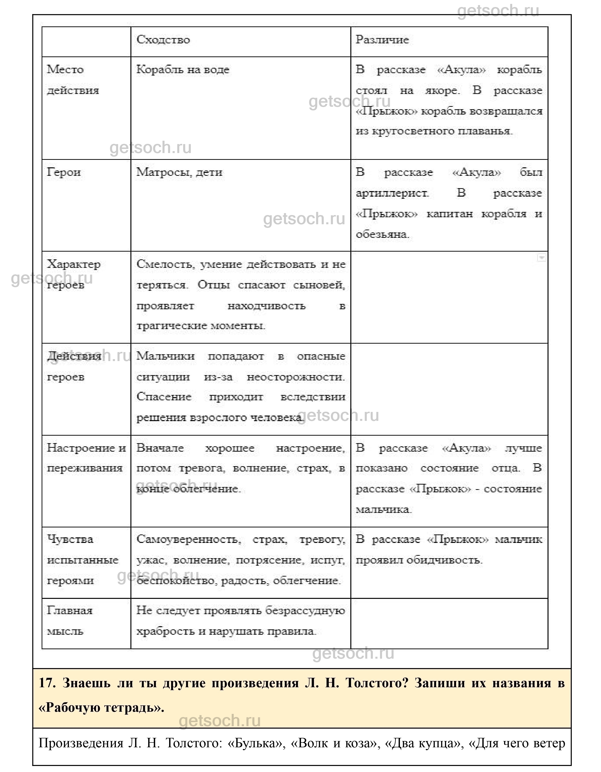 16. Сравни рассказы Л. Н. Толстого «Акула» и «Прыжок». Что в них общего? Чем они различаются? Заполни таблицу в «Рабочей тетради».