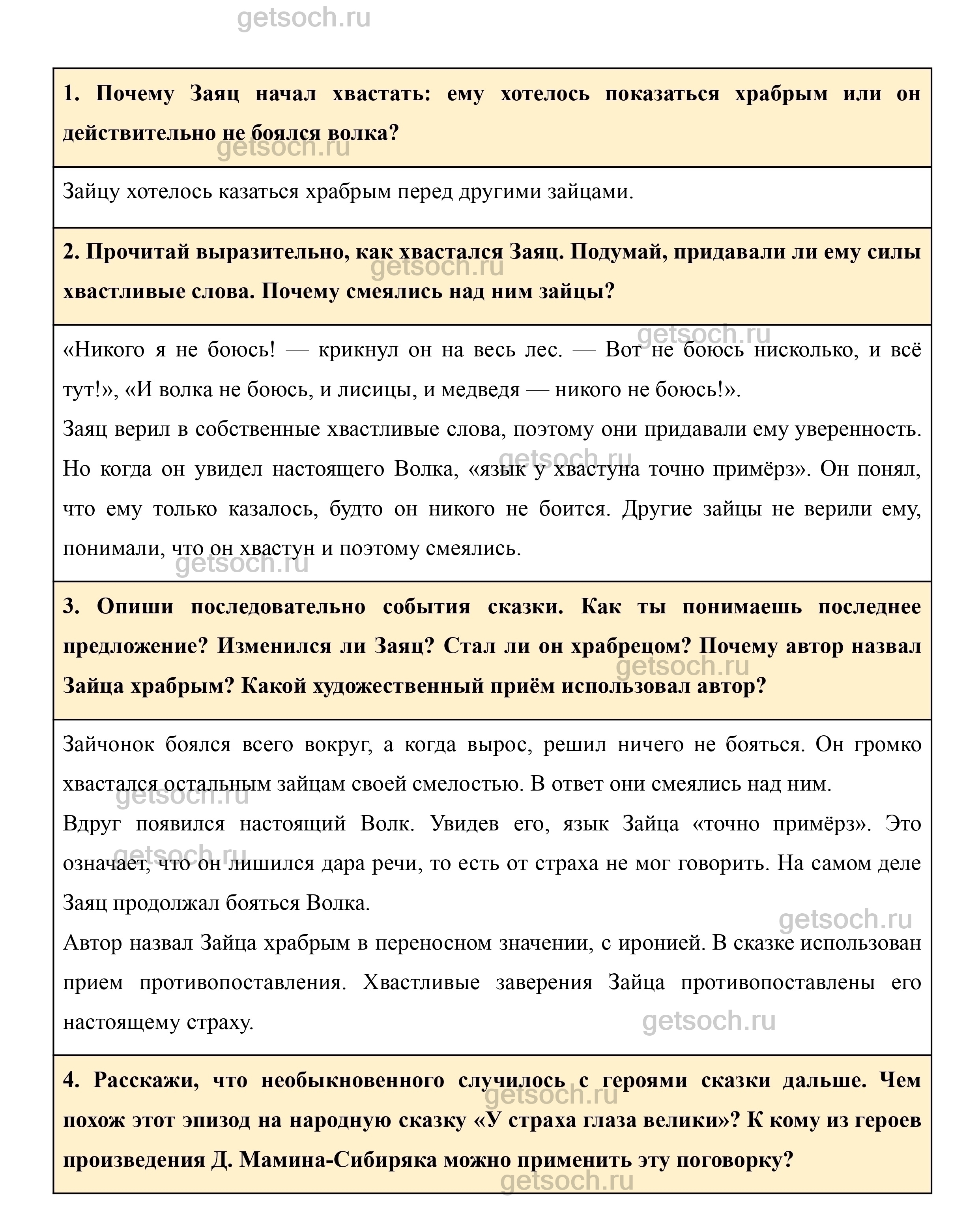 3. Опиши последовательно события сказки. Как ты понимаешь последнее предложение? Изменился ли Заяц? Стал ли он храбрецом? Почему автор назвал Зайца храбрым? Какой художественный приём использовал автор?