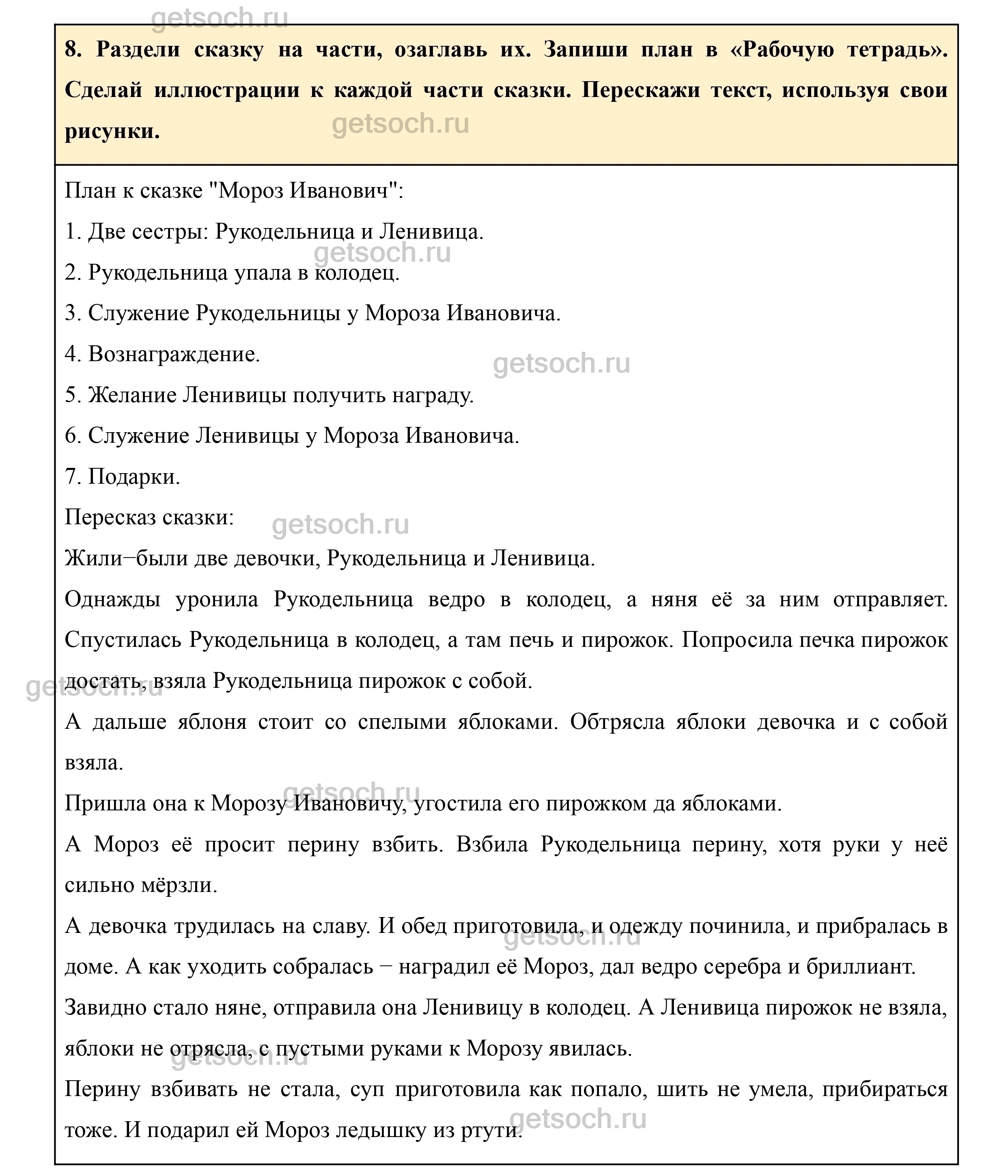 8. Раздели сказку на части, озаглавь их. Запиши план в «Рабочую тетрадь». Сделай иллюстрации к каждой части сказки. Перескажи текст, используя свои рисунки.