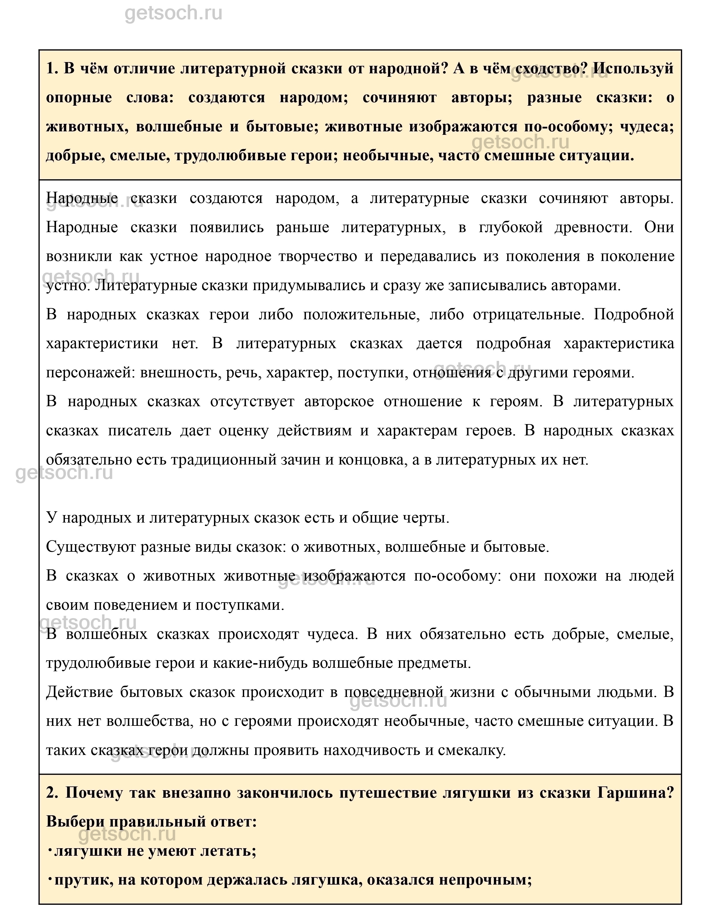 1. В чём отличие литературной сказки от народной? А в чём сходство? Используй опорные слова: создаются народом; сочиняют авторы; разные сказки: о животных, волшебные и бытовые; животные изображаются по-особому; чудеса; добрые, смелые, трудолюбивые герои; необычные, часто смешные ситуации.