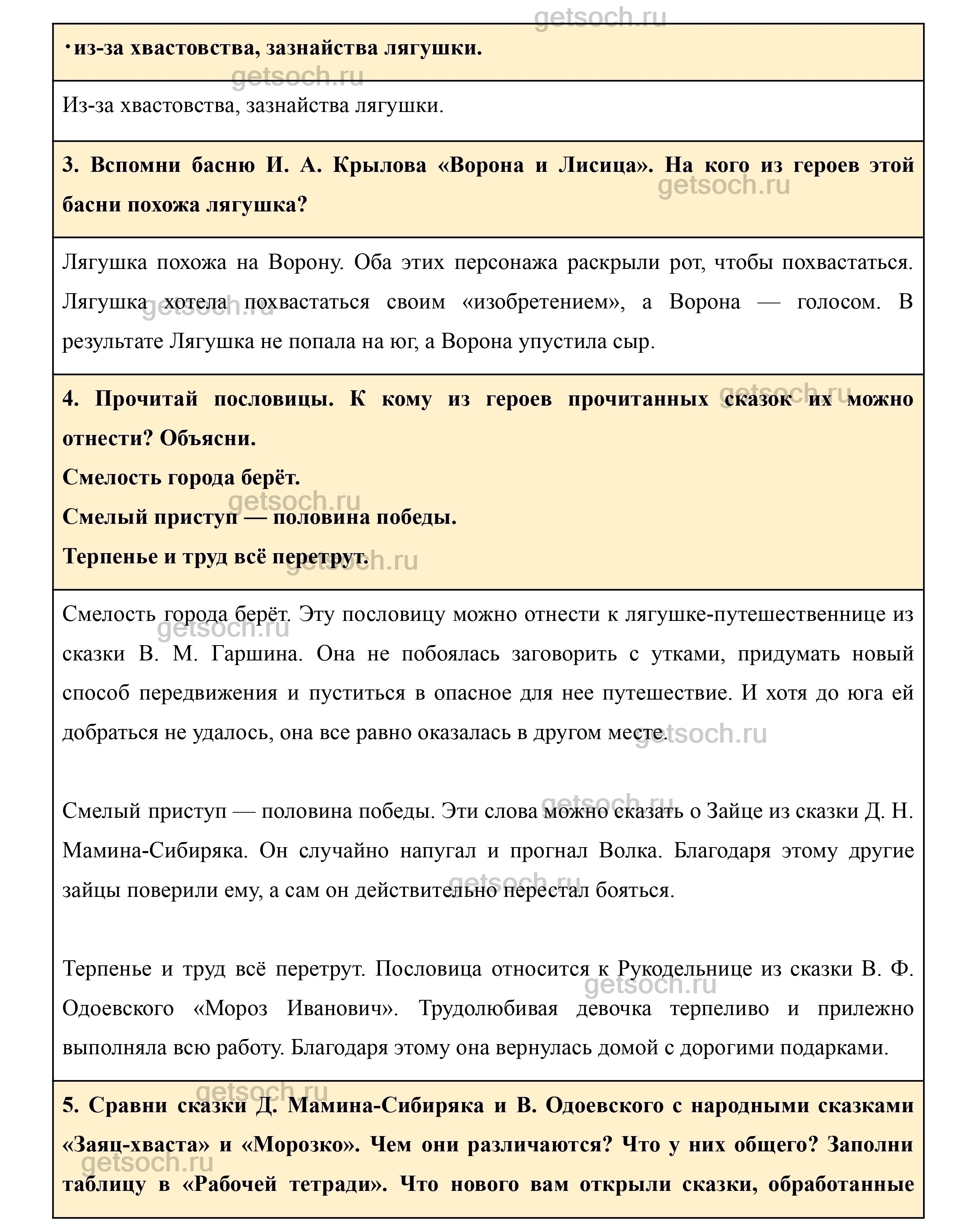 5. Сравни сказки Д. Мамина-Сибиряка и В. Одоевского с народными сказками «Заяц-хваста» и «Морозко». Чем они различаются? Что у них общего? Заполни таблицу в «Рабочей тетради». Что нового вам открыли сказки, обработанные писателями?