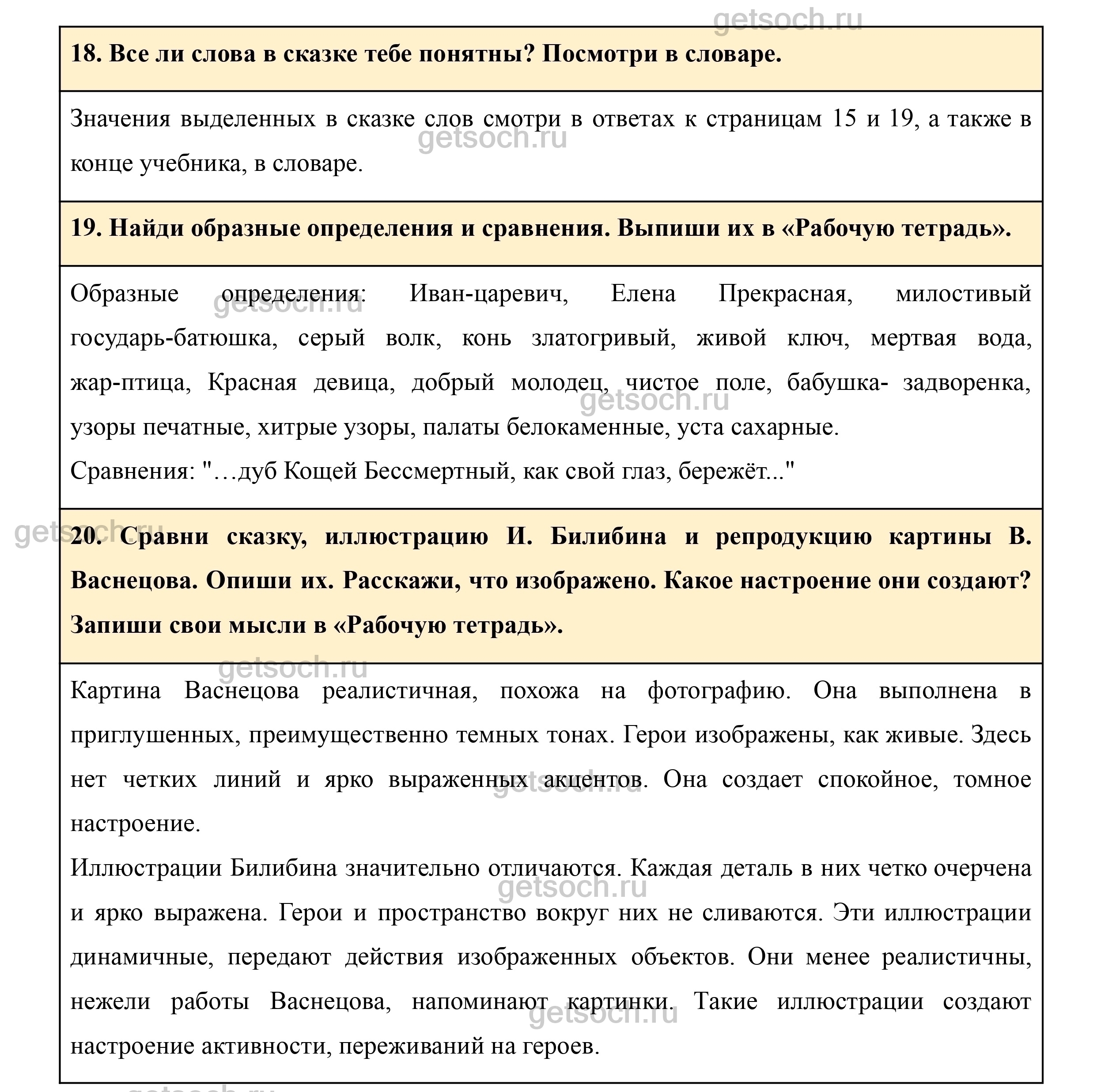 20. Сравни сказку, иллюстрацию И. Билибина и репродукцию картины В. Васнецова. Опиши их. Расскажи, что изображено. Какое настроение они создают? Запиши свои мысли в «Рабочую тетрадь».