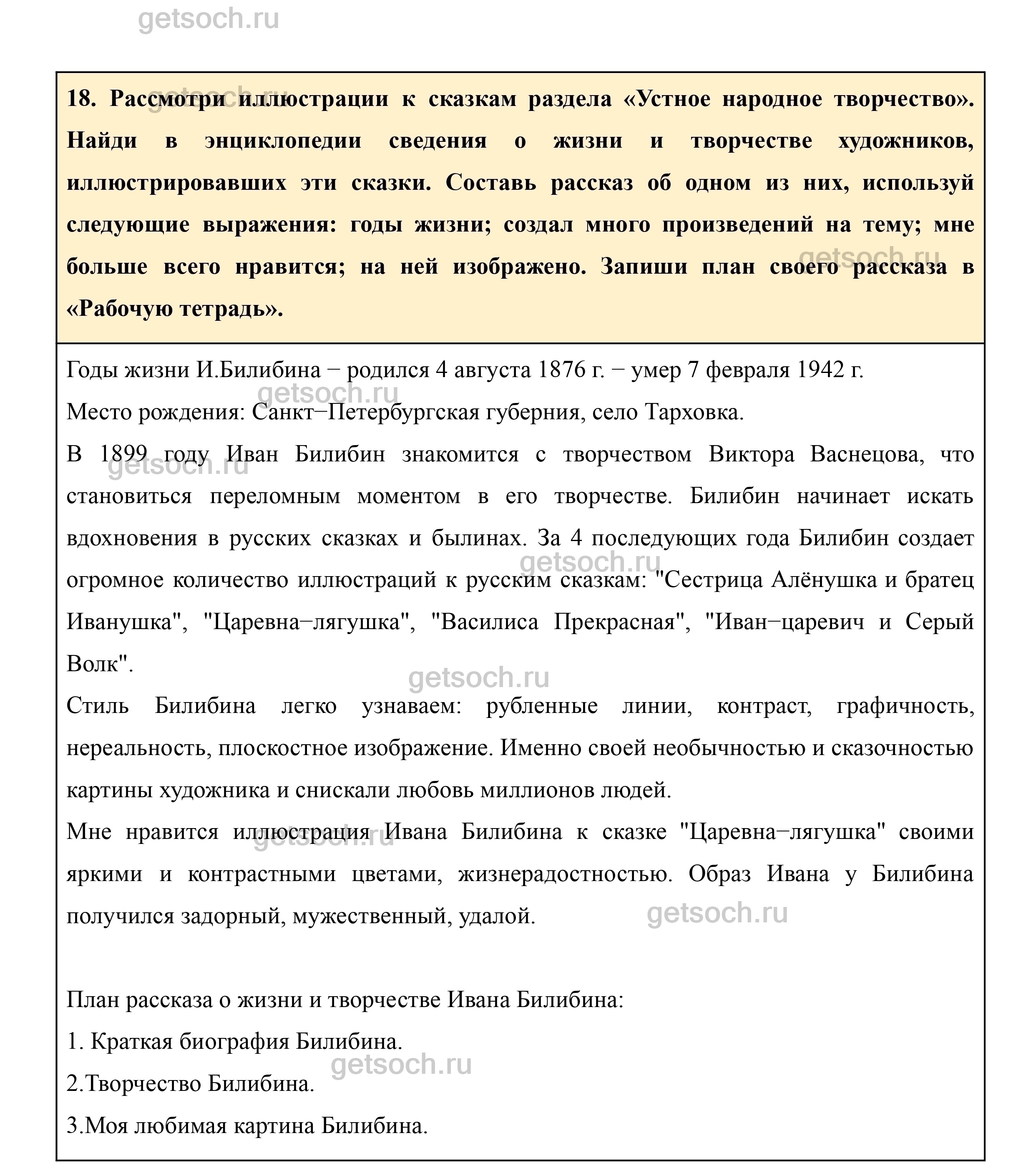 18. Рассмотри иллюстрации к сказкам раздела «Устное народное творчество». Найди в энциклопедии сведения о жизни и творчестве художников, иллюстрировавших эти сказки. Составь рассказ об одном из них, используй следующие выражения: годы жизни; создал много произведений на тему; мне больше всего нравится; на ней изображено. Запиши план своего рассказа в «Рабочую тетрадь».