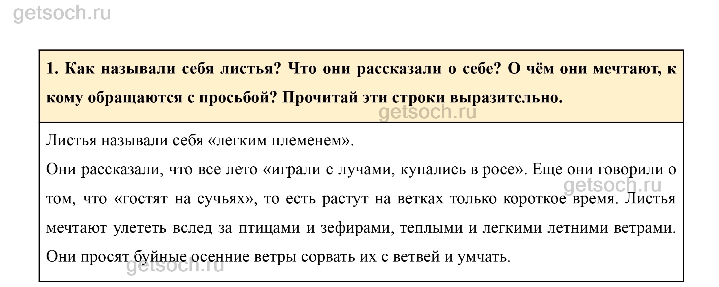 1. Как называли себя листья? Что они рассказали о себе? О чём они мечтают, к кому обращаются с просьбой? Прочитай эти строки выразительно.