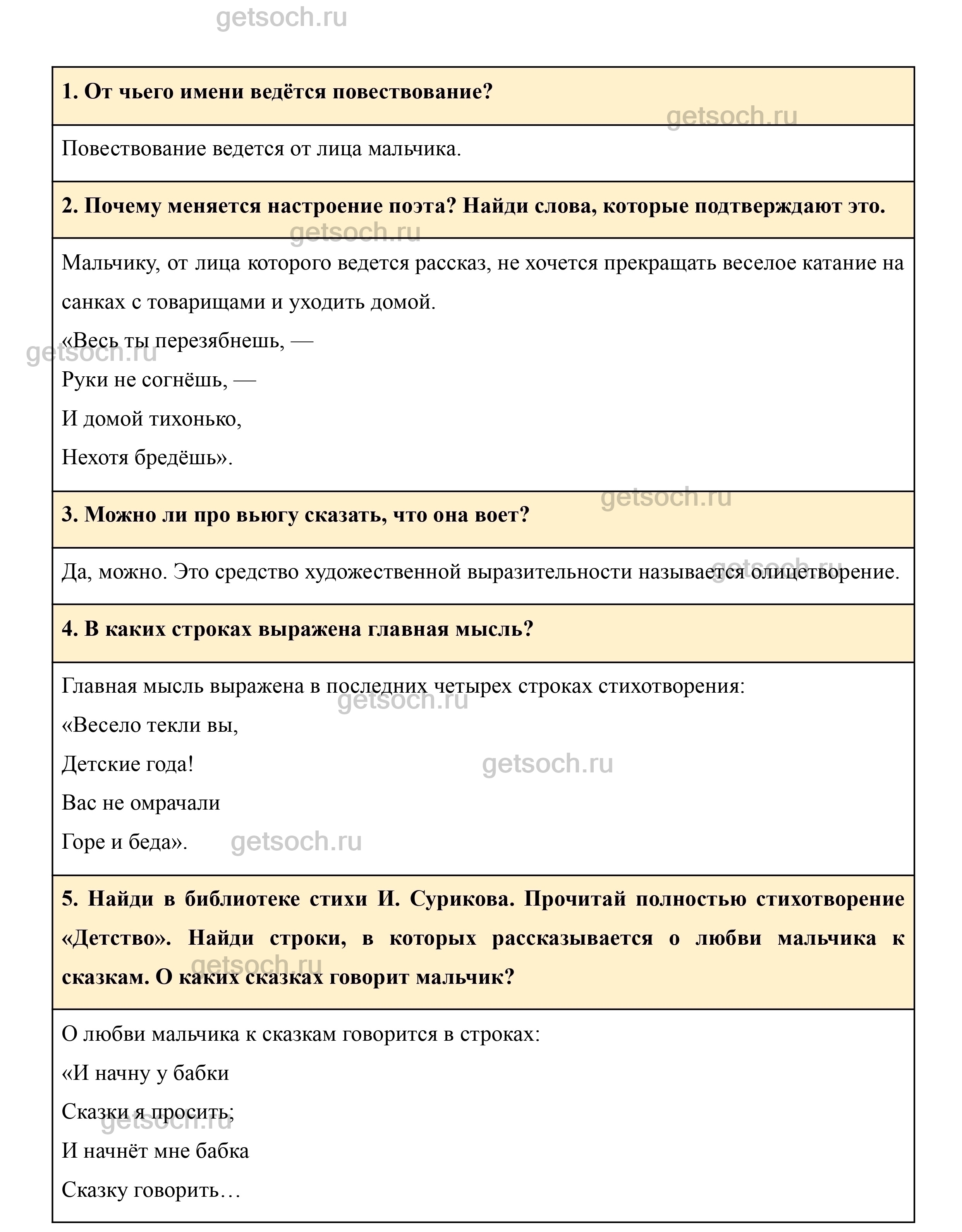 5. Найди в библиотеке стихи И. Сурикова. Прочитай полностью стихотворение «Детство». Найди строки, в которых рассказывается о любви мальчика к сказкам. О каких сказках говорит мальчик?