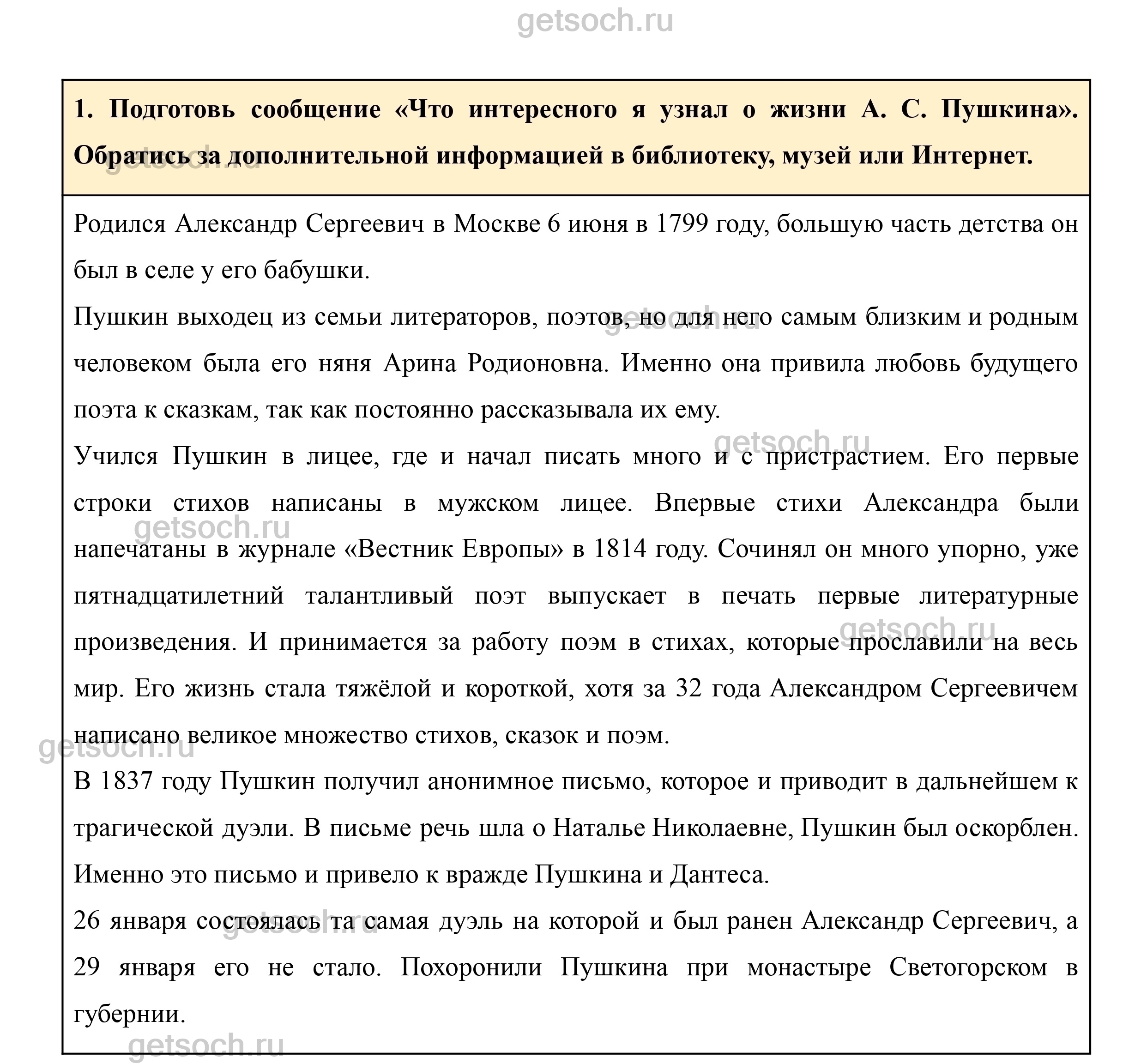1. Подготовь сообщение «Что интересного я узнал о жизни А. С. Пушкина». Обратись за дополнительной информацией в библиотеку, музей или Интернет.
