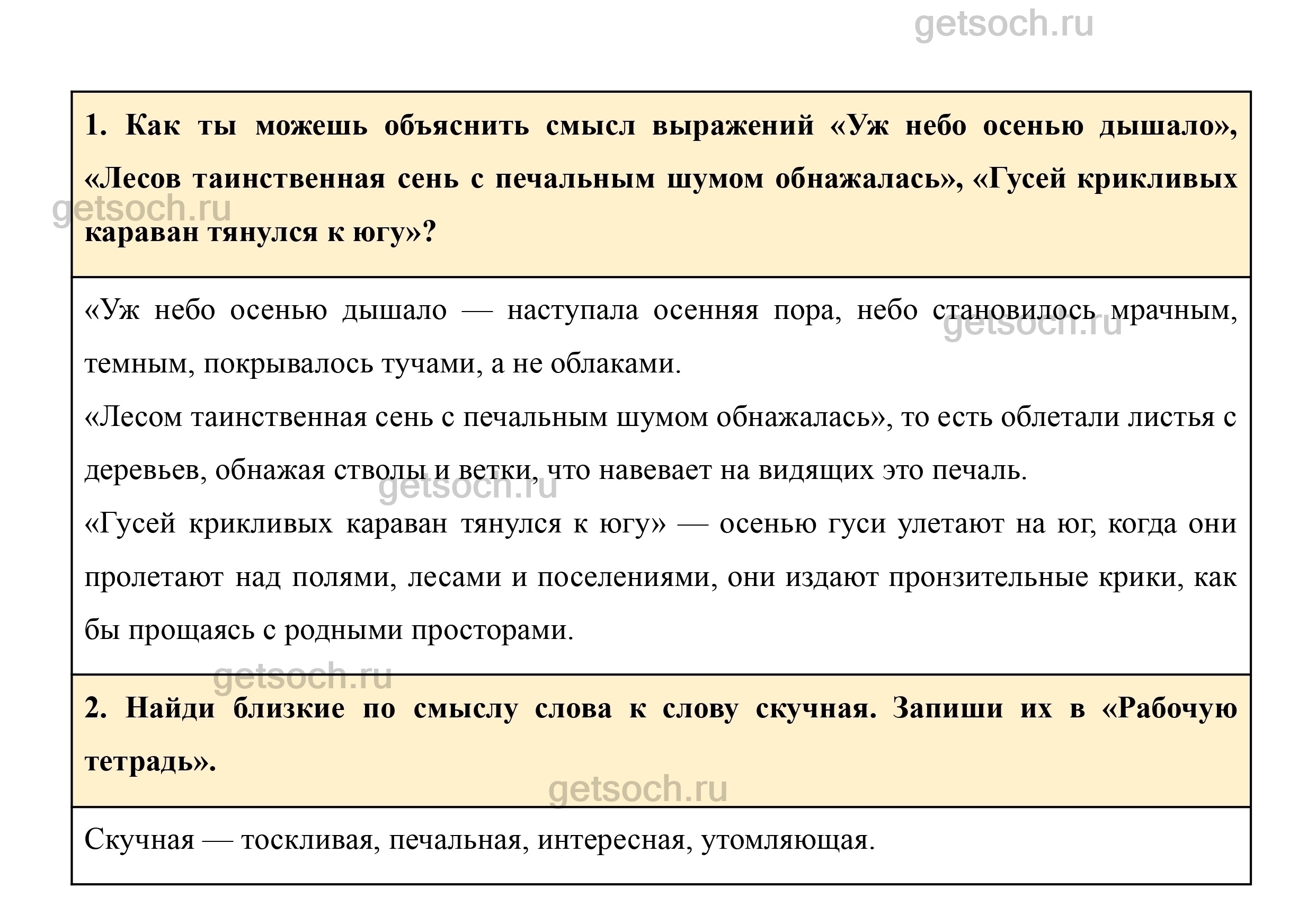 1. Как ты можешь объяснить смысл выражений «Уж небо осенью дышало», «Лесов таинственная сень с печальным шумом обнажалась», «Гусей крикливых караван тянулся к югу»?