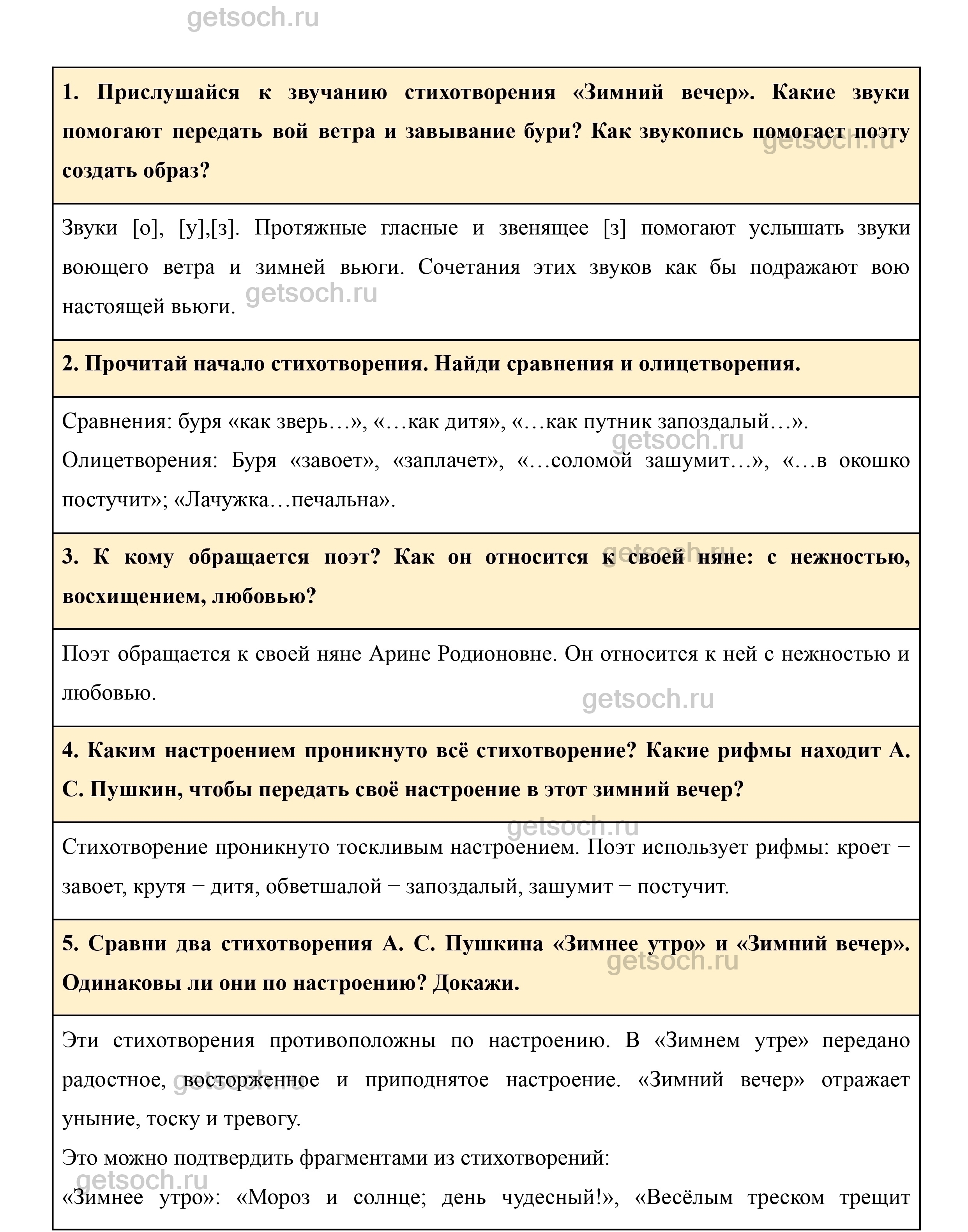 1. Прислушайся к звучанию стихотворения «Зимний вечер». Какие звуки помогают передать вой ветра и завывание бури? Как звукопись помогает поэту создать образ?