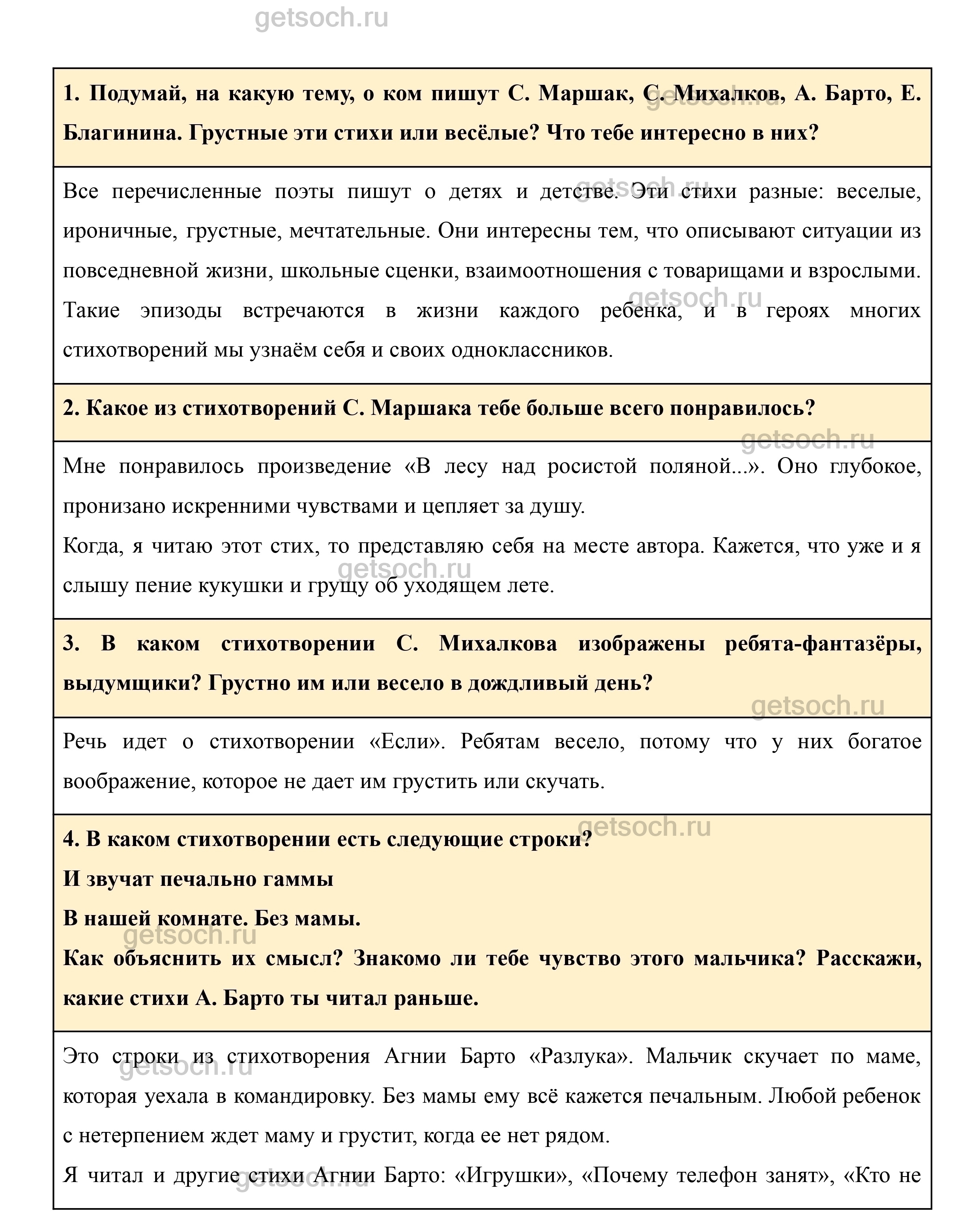1. Подумай, на какую тему, о ком пишут С. Маршак, С. Михалков, А. Барто, Е. Благинина. Грустные эти стихи или весёлые? Что тебе интересно в них?