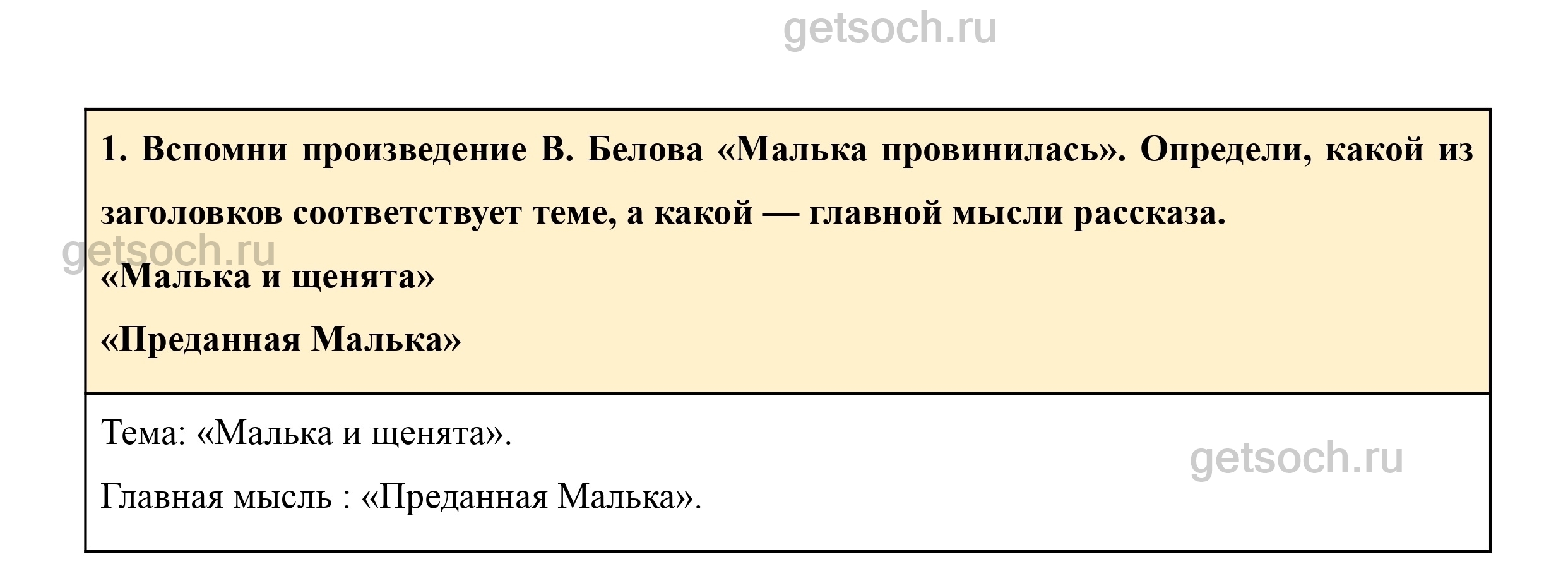 1. Вспомни произведение В. Белова «Малька провинилась». Определи, какой из заголовков соответствует теме, а какой — главной мысли рассказа.