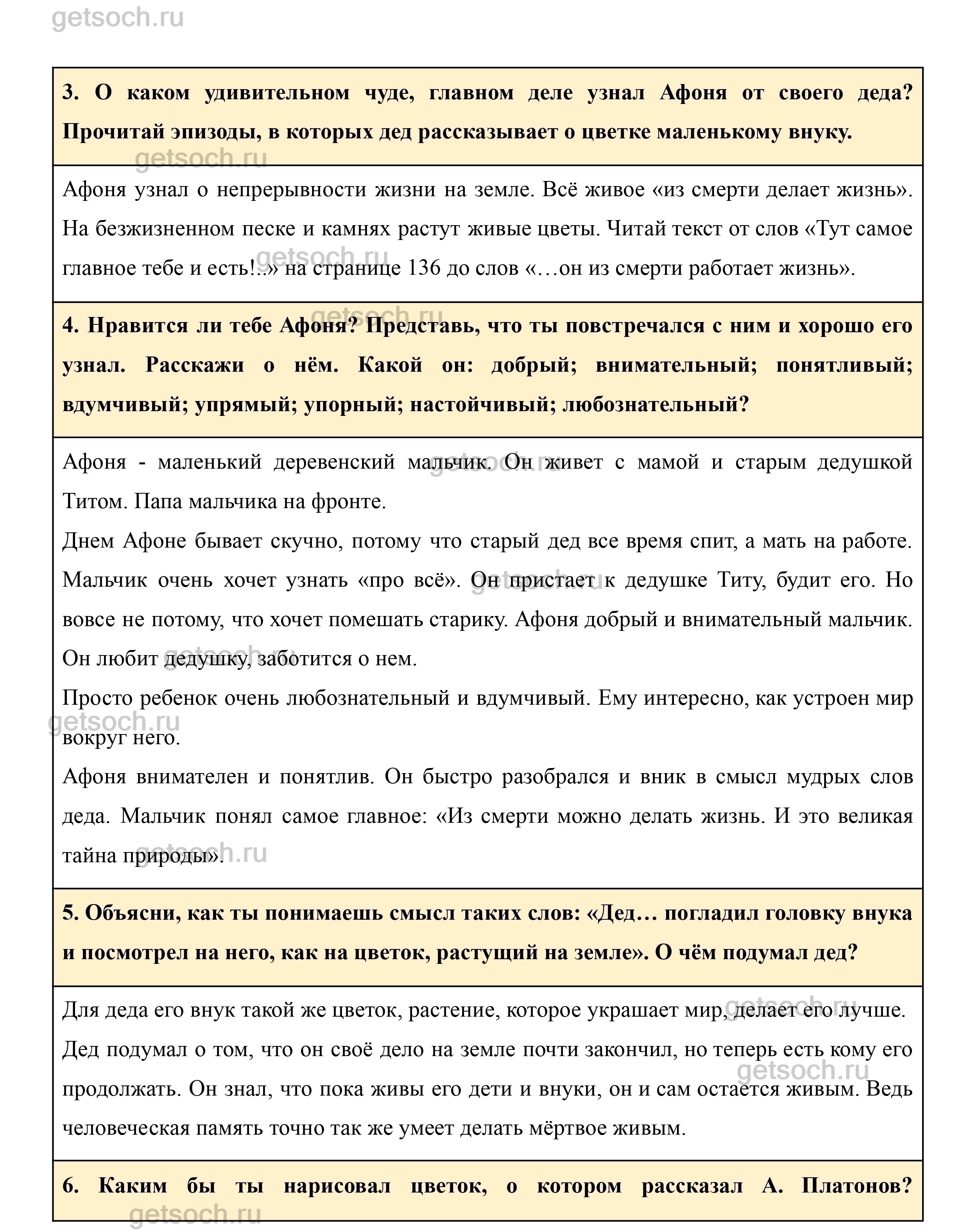 6. Каким бы ты нарисовал цветок, о котором рассказал А. Платонов? Поразмышляй, почему именно так он назвал своё произведение. Если бы тебя попросили сказать, о чём рассказ писателя, что бы ты ответил?