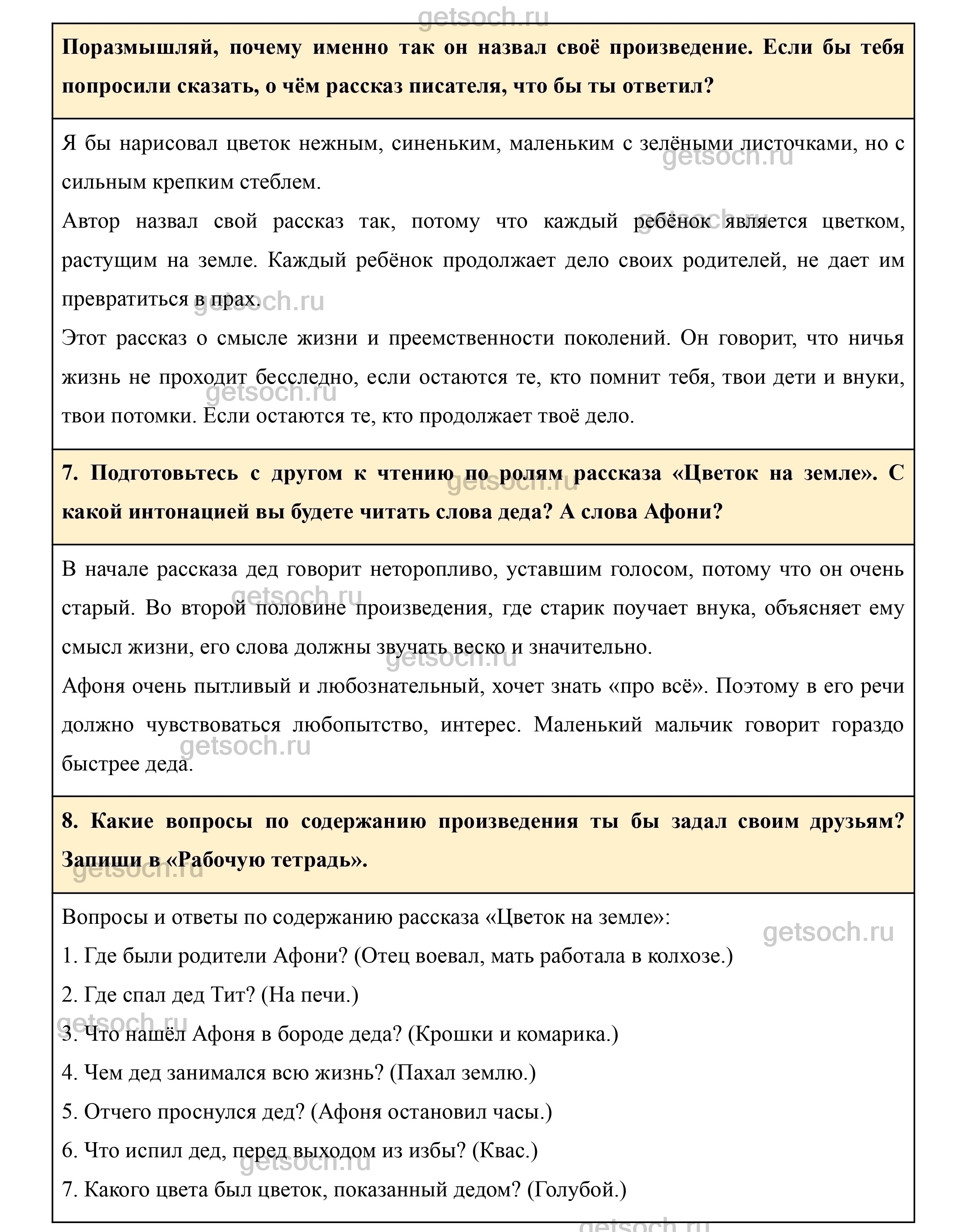 7. Подготовьтесь с другом к чтению по ролям рассказа «Цветок на земле». С какой интонацией вы будете читать слова деда? А слова Афони?