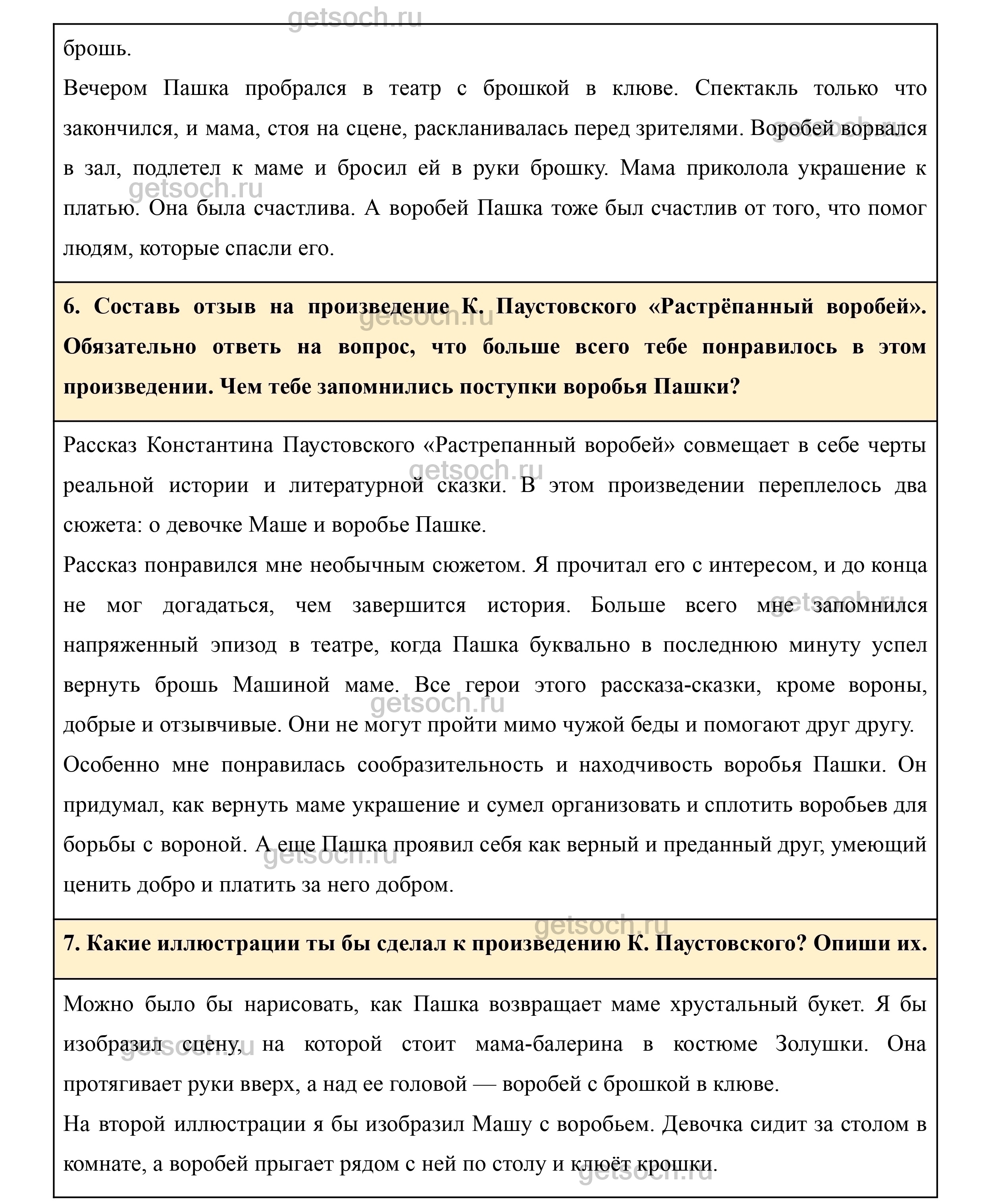 6. Составь отзыв на произведение К. Паустовского «Растрёпанный воробей». Обязательно ответь на вопрос, что больше всего тебе понравилось в этом произведении. Чем тебе запомнились поступки воробья Пашки?