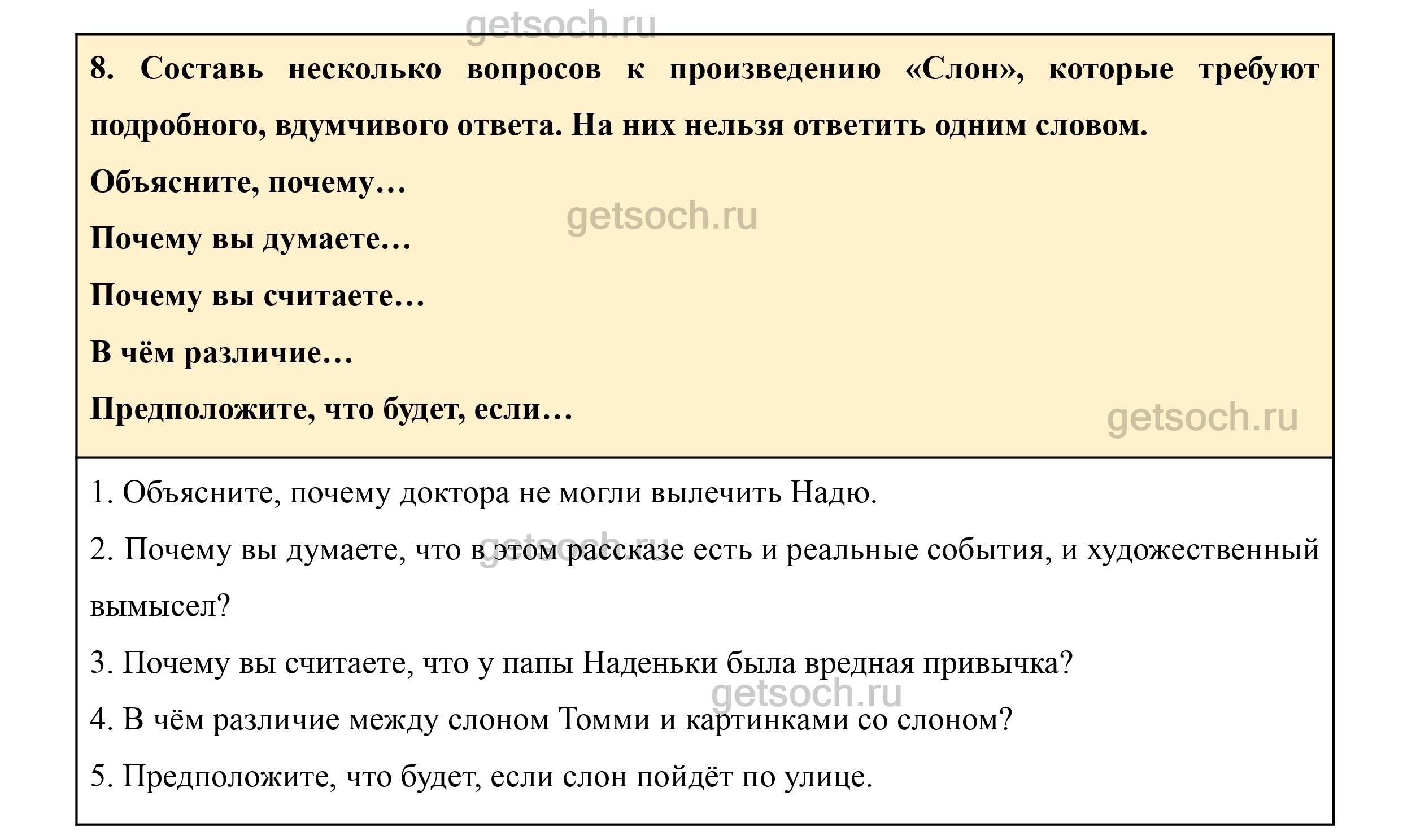8. Составь несколько вопросов к произведению «Слон», которые требуют подробного, вдумчивого ответа. На них нельзя ответить одним словом.