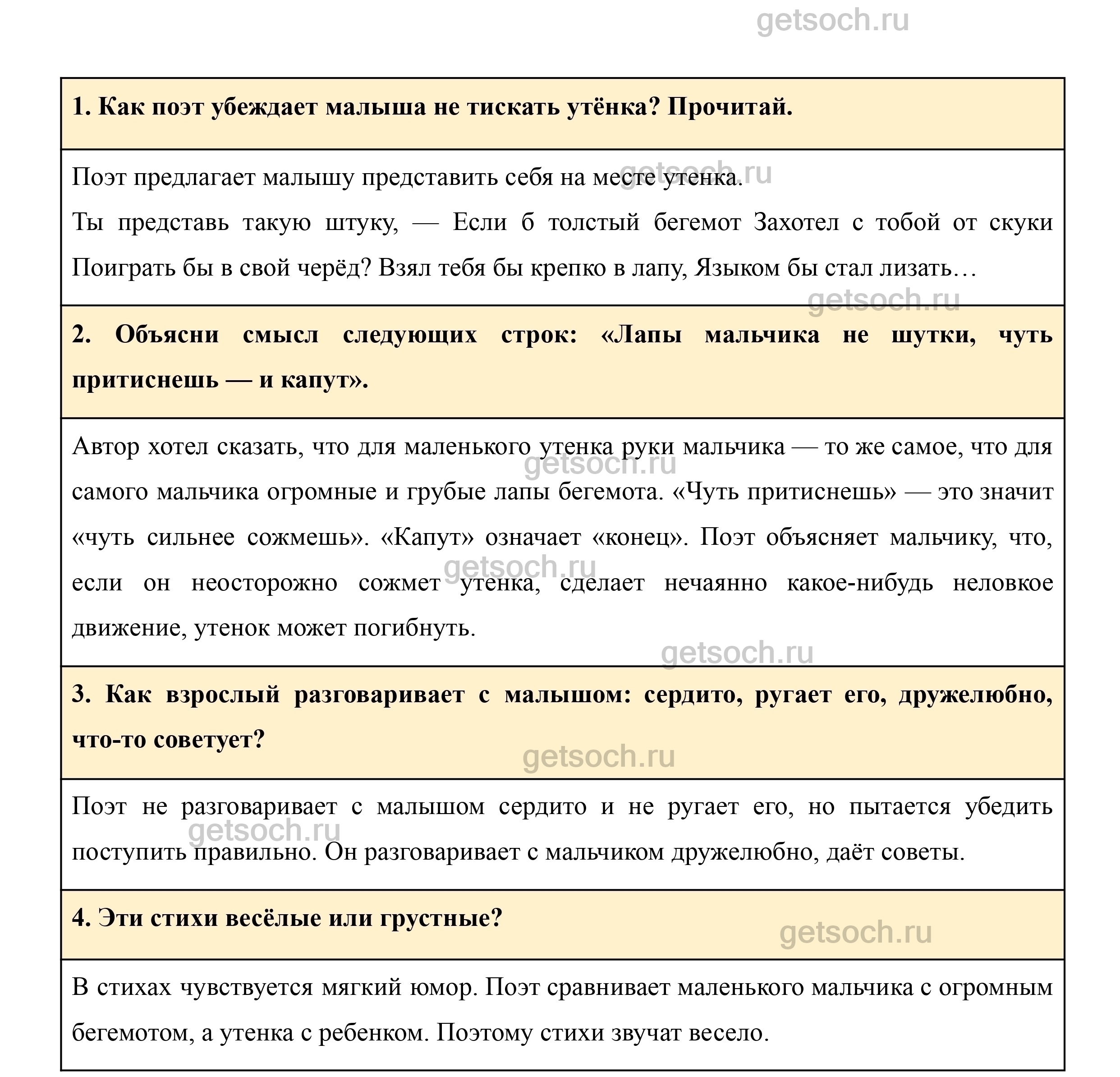1. Как поэт убеждает малыша не тискать утёнка? Прочитай.