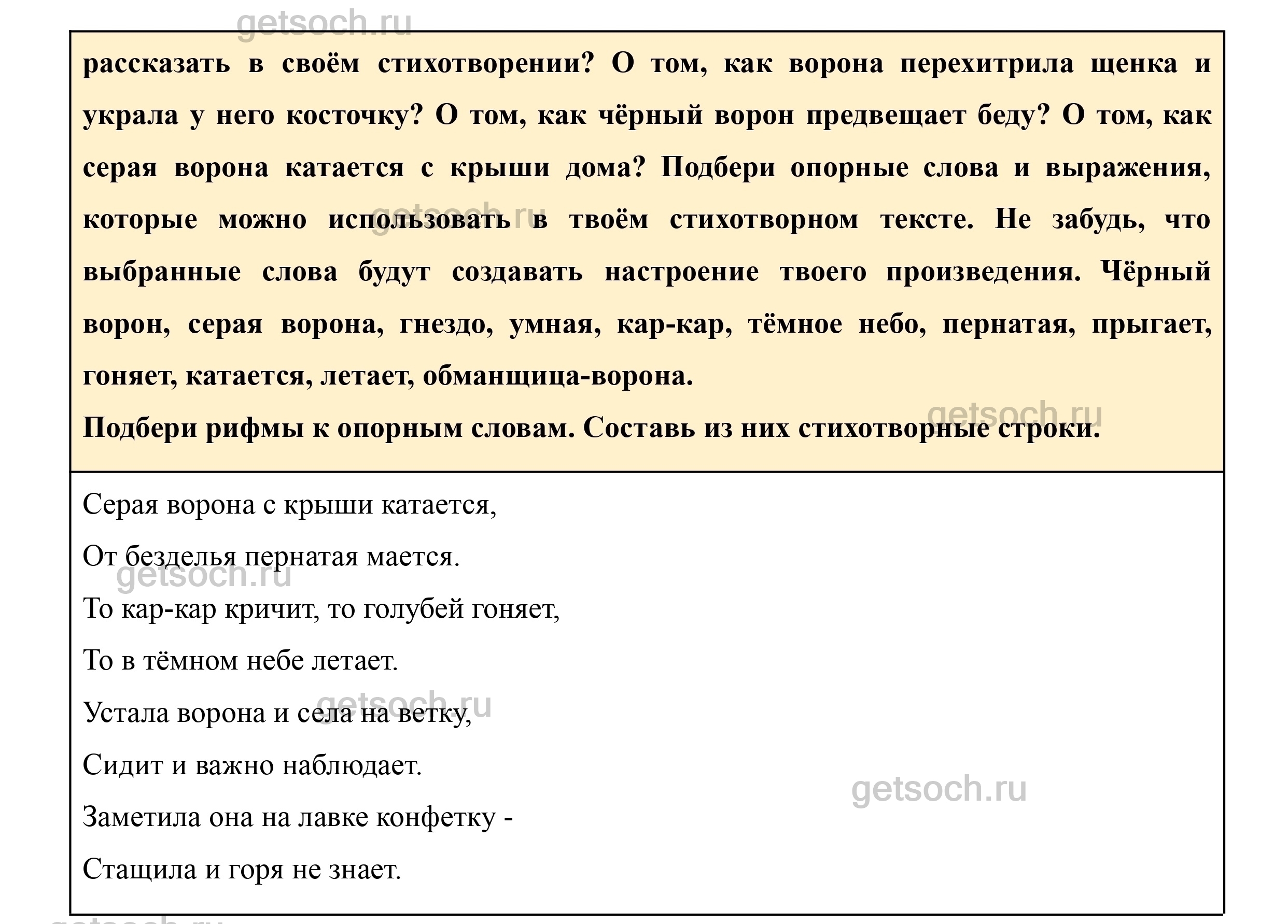 8. Придумай самостоятельно стихотворение про ворону. Опиши, как выглядит ворона. Подумай, какие у ворон есть интересные повадки. Понаблюдай за ней на улице, возможно, ты подметишь ещё что-то интересное. О чём ты хочешь рассказать в своём стихотворении? О том, как ворона перехитрила щенка и украла у него косточку? О том, как чёрный ворон предвещает беду? О том, как серая ворона катается с крыши дома? Подбери опорные слова и выражения, которые можно использовать в твоём стихотворном тексте. Не забудь, что выбранные слова будут создавать настроение твоего произведения. Чёрный ворон, серая ворона, гнездо, умная, кар-кар, тёмное небо, пернатая, прыгает, гоняет, катается, летает, обманщица-ворона.