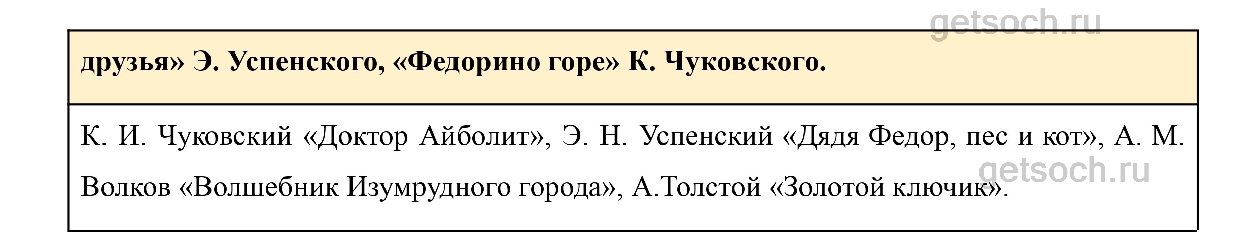 4. Ты прочитал много сказок, которые пересказали писатели. Например, «Теремок» Е. Чарушина, «Сказка о рыбаке и рыбке» А. Пушкина. А знаешь ли ты сказки, которые писатели придумали сами? Например, «Крокодил Гена и его друзья» Э. Успенского, «Федорино горе» К. Чуковского.