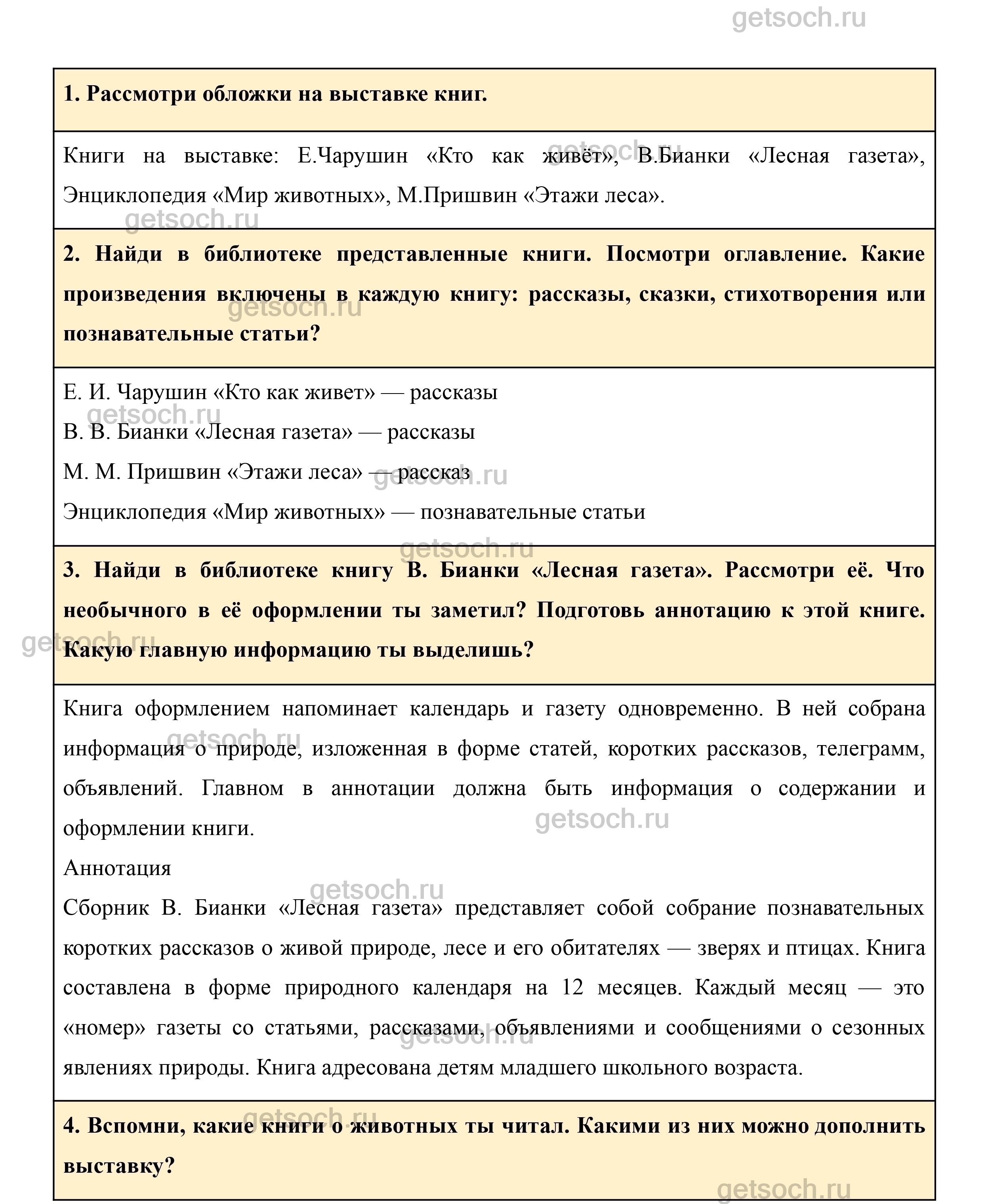 3. Найди в библиотеке книгу В. Бианки «Лесная газета». Рассмотри её. Что необычного в её оформлении ты заметил? Подготовь аннотацию к этой книге. Какую главную информацию ты выделишь?