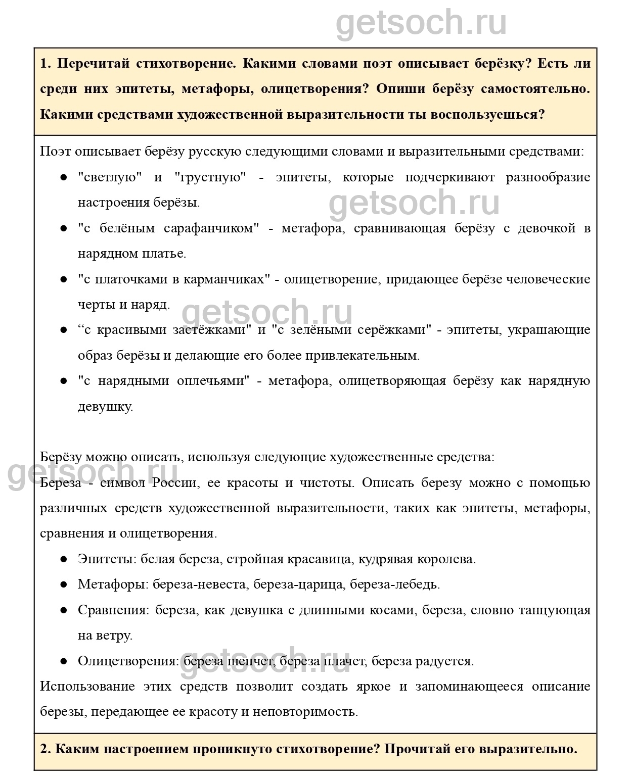 Перечитай стихотворение. Какими словами поэт описывает берёзку? Есть ли среди них эпитеты, метафоры, олицетворения? Опиши берёзу самостоятельно. Какими средствами художественной выразительности ты воспользуешься?
