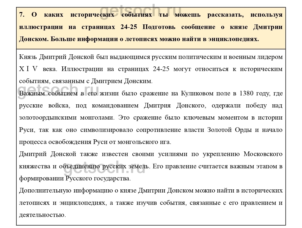О каких исторических событиях ты можешь рассказать, используя иллюстрации на страницах 24-25 Подготовь сообщение о князе Дмитрии Донском. Больше информации о летописях можно найти в энциклопедиях.